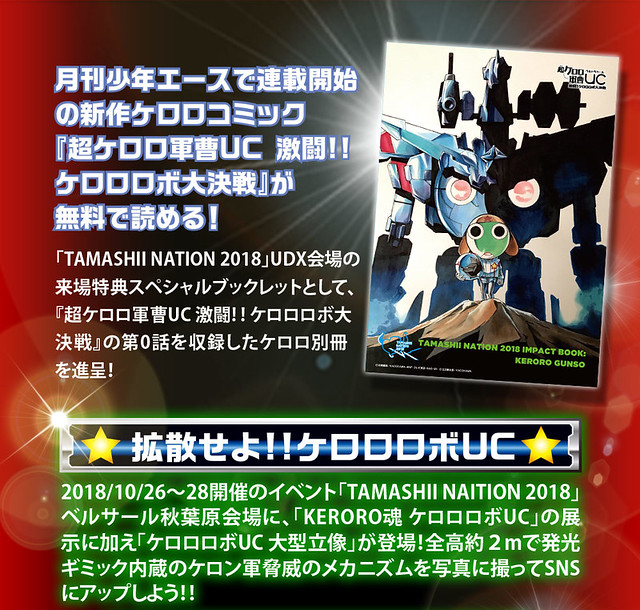 此外在本週末舉行的「TAMASHII NATION 2018」也將展出這架「KERORO機器人UC」的兩公尺大立像,喜愛《KERORO軍曹》的玩具人有機會的話一定要前往參展呀!
