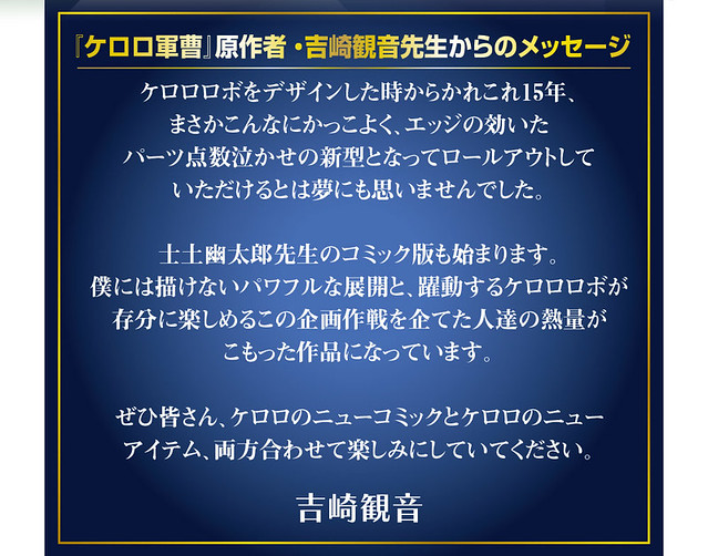 為紀念日本漫畫家吉崎觀音創作的人氣搞笑漫畫《KERORO軍曹》迎來 20 週年,以及新作漫畫《超KERORO軍曹UC 激鬥!!KERORO機器人大決戰》即將開始連載,日本 BANDAI SPIRITS 公司收藏事業部(TAMASHII NATION)於今(25)日發表了紀念商品「KERORO魂 KERORO機器人UC」預計於 2019 年 05 月發售的消息。