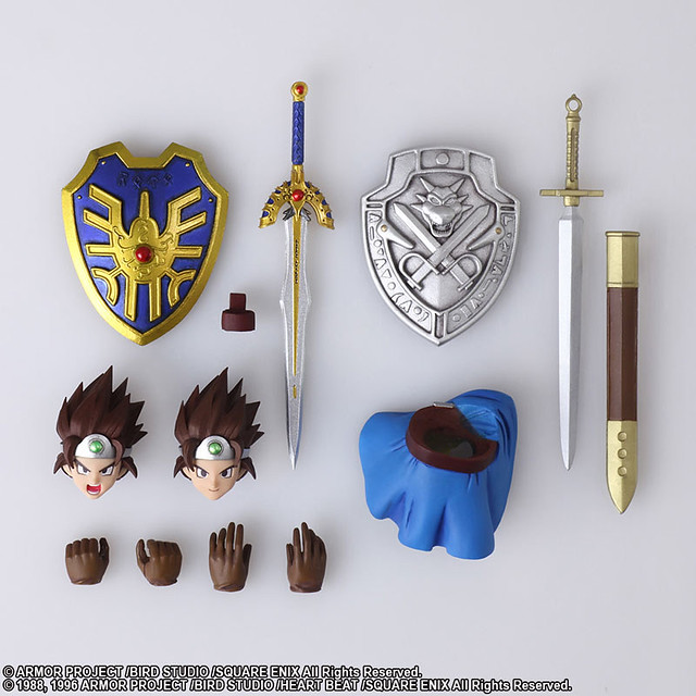 這次將知名漫畫家「鳥山明」老師所作的《勇者鬥惡龍III》角色設定「勇者」造型完整再現,此次作品附有劍、盾、羅德(ロト)、羅德的劍、羅德的盾牌、替換手首配件×4、替換臉配件×2、替換用衣襬、史萊姆、支撐架以及底座等等豐富配件,可運用替換用衣襬配件來呈現其蹲下的姿態,另外武器配件部份運用亮面塗裝來表現金屬的質感,喜愛《勇者鬥惡龍》遊戲系列的玩具人可以參考一下歐!