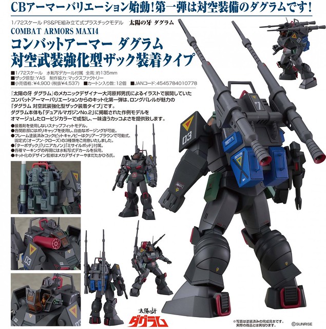 此次是機械設計師‧「大河原邦男」所負責繪製的COMBAT ARMORS變化版本,將"達格拉姆 對空武裝強化型背包裝置形態"機體附有的「渦輪背包」、「長型加農砲」、「飛彈匣」完整收錄,此次機體配色仿造了「DUAL MAGAZINE No.2」雜誌中刊載的範例,運用低能見度顏色成型來製作出不同韻味的配色模樣,各關節採用軟膠零件,可自由擺出動作姿勢,附有各種標誌的水轉印貼紙,喜愛《太陽之牙 達格拉姆》動畫系列的玩具人可以參考一下歐。