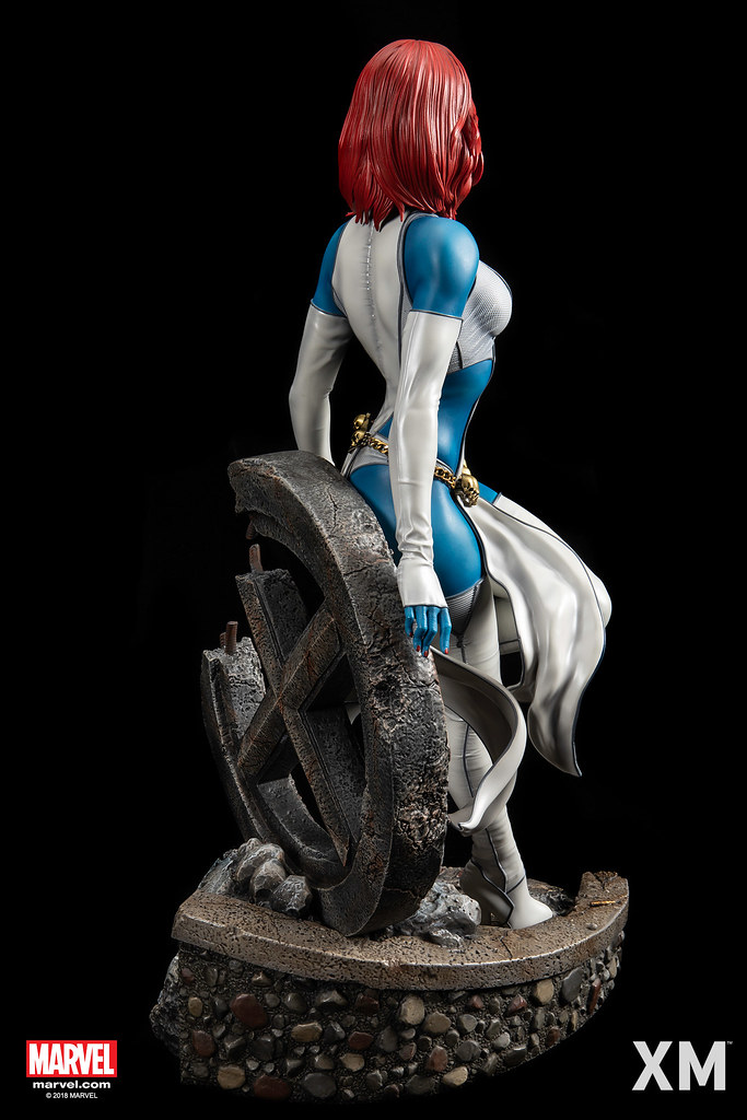 頭雕部分再現了魔形女在漫畫裡的金黃色雙眸,藍色皮膚上的鮮豔紅唇非常搶眼!紅色長髮生動地形塑出飄逸感,搭配雙手持槍的狀態,彷彿在吹熄槍口的硝煙,還有一個短髮的頭雕和左、右各一的替換手臂零件,以「變種人學校(Xavier’s School for Gifted Youngsters)」建物殘骸為題製作的地台也相當出色,瓦礫、碎石堆、外露的鋼筋都施以逼真的舊化、毀損痕跡,讓作品的展示性、故事性都再提升!