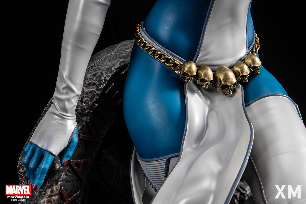 魔形女是一位能夠變形成任何人的外貌並模仿其聲音的變種人,自己本身是藍皮膚、黃眼睛,留著一頭鮮豔的紅髮,在電影的設定中,還在皮膚上增加了類似鱗片的造型。「魔形女 1/4 比例全身雕像」根據漫畫中身穿白色緊身衣的經典形象打造,有著迷人的身形曲線,皮膚表面還帶有光澤,服裝除了有寫實的皺褶表現外,各處都有細膩的造型巧思,像是細小格紋纖維布料的塑造、拉鍊的還原......等,腰際的金色骷髏項鍊則有著厚重的金屬感,甚至把氧化、鏽蝕的質感都做了出來。