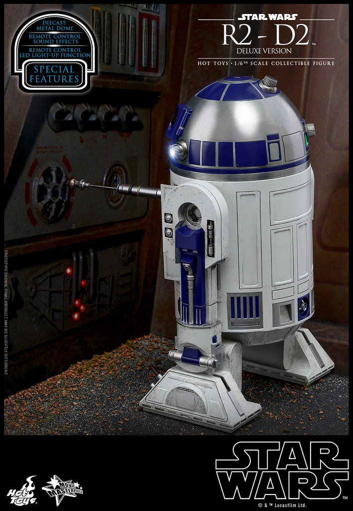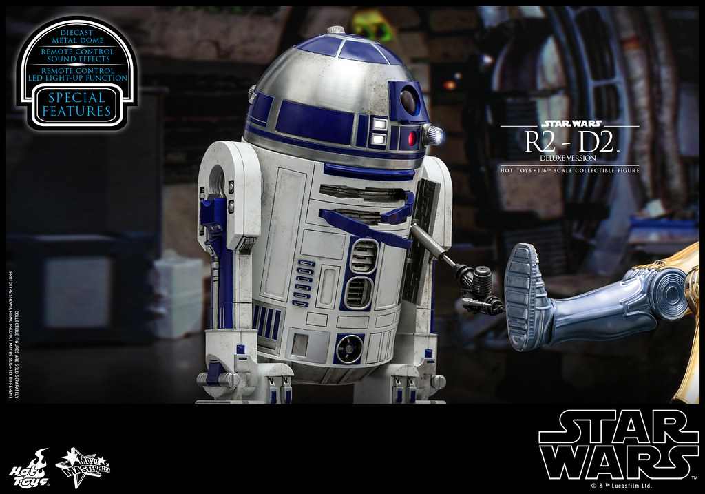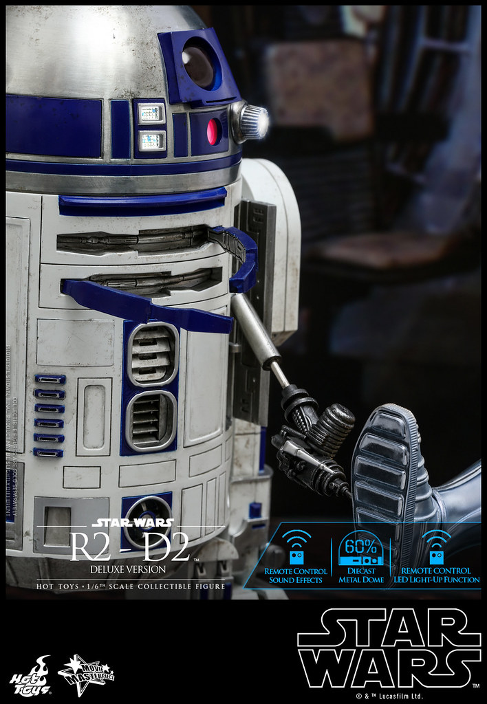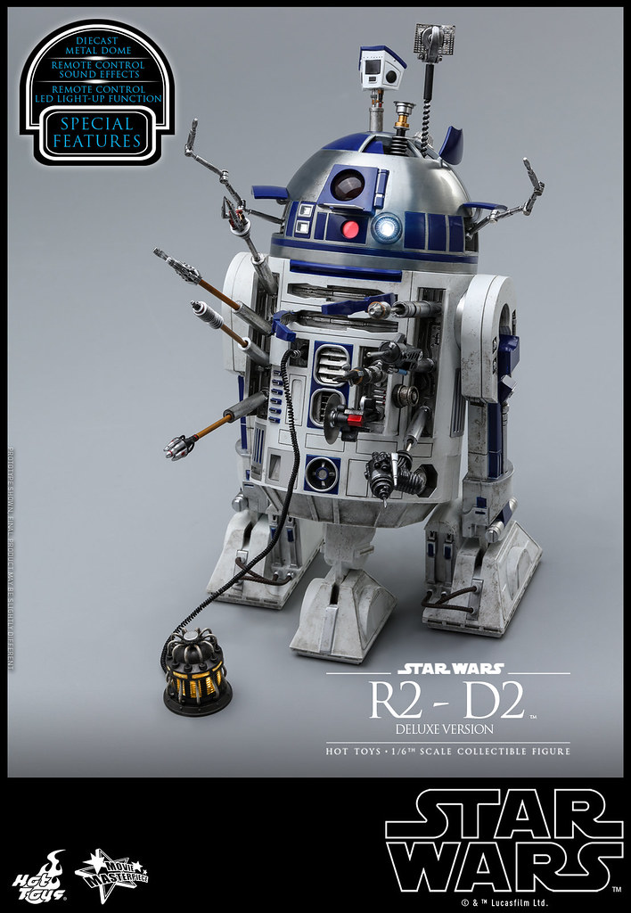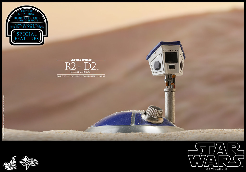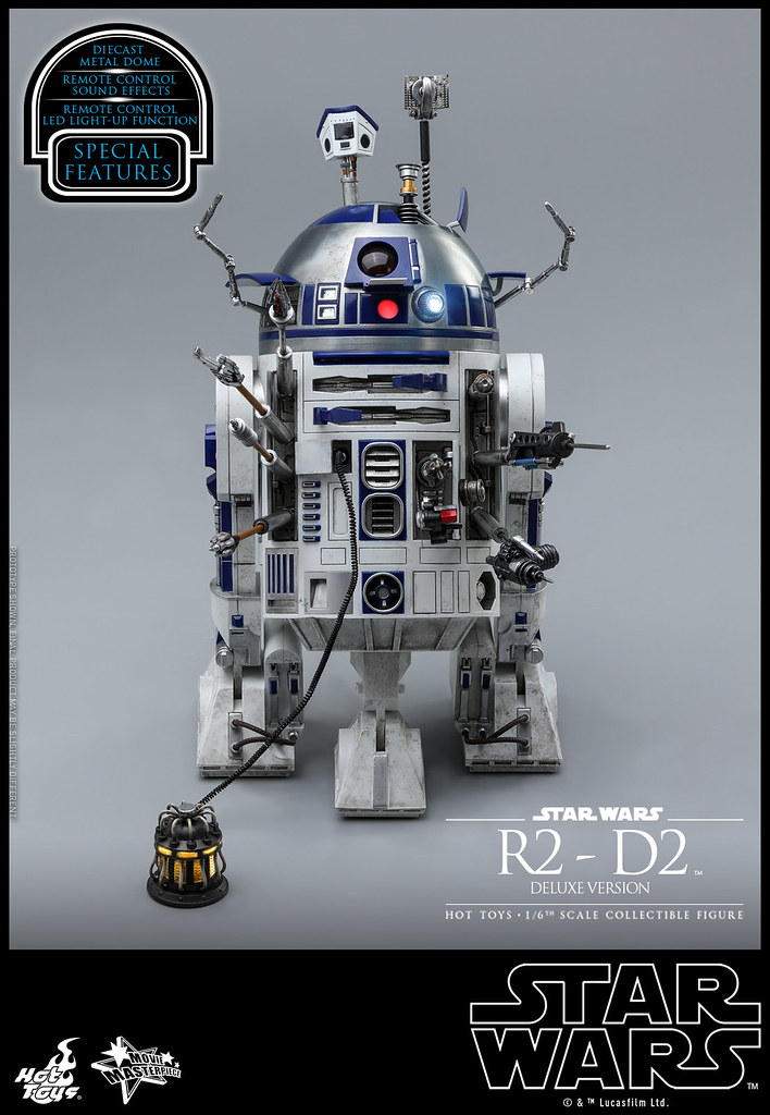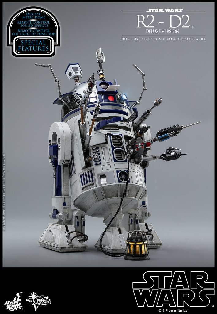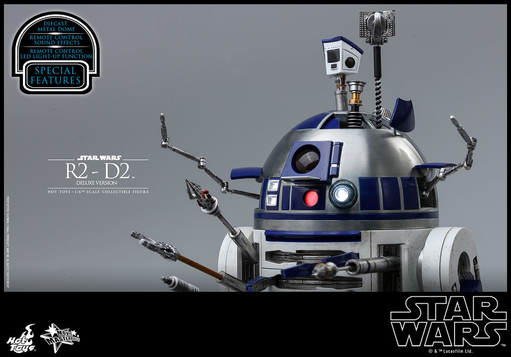 「R2-D2 1/6 比例豪華版機器人偶」高約18 公分,再現了經典三部曲的機體外觀,各處細節都有著精緻的刻畫,寫實的舊化處理讓整體的真實感更為強烈!在半圓頂部分有60%採用合金材質的零件製作,而本作最精彩的絕對是藉著各部位機關的開闔、豐富的配件,以及內置的LED 發光功能,再現包含開門、探測、修理東西、發射光劍給路克......等經典場景!