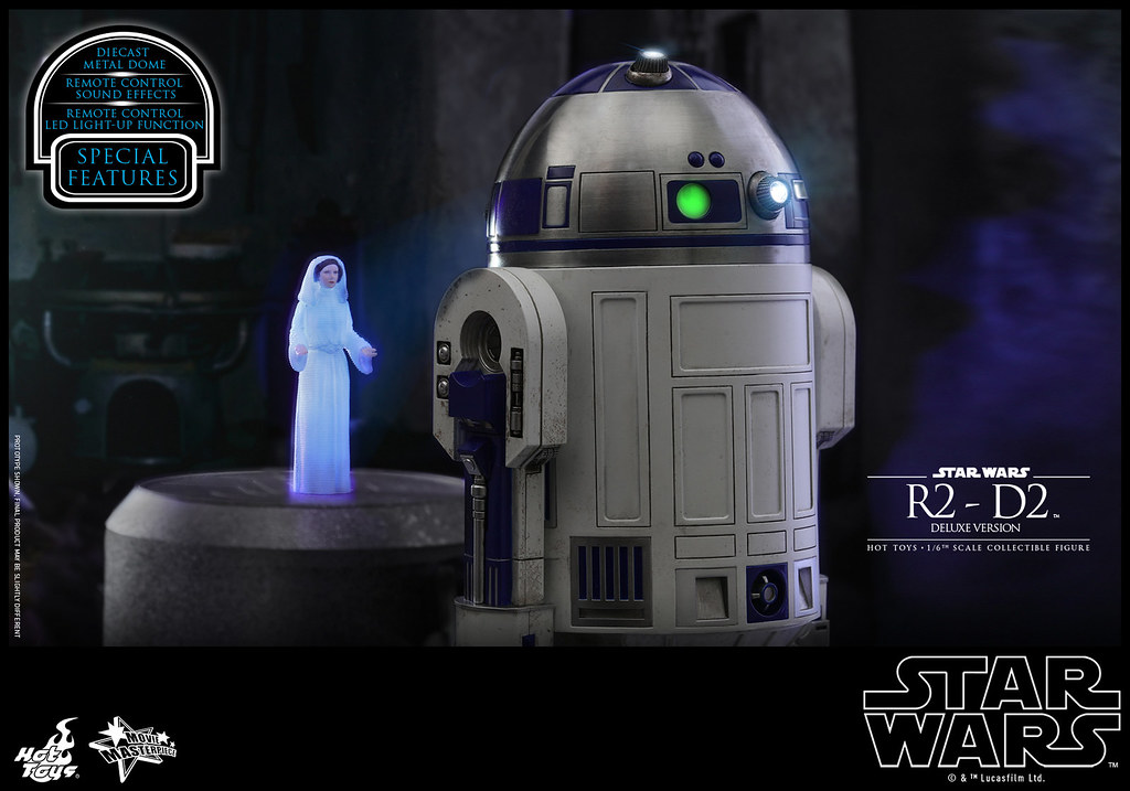 滾輪設計讓這款R2 可如同劇中那樣滑動,第三隻輔助腳也可以收納置機身裡頭,而且玩家還可以遙控R2 讓它發出精彩的聲光效果,共有8 處可發光、14 種經典音效,再加上兩個莉亞公主在《星際大戰四部曲:曙光乍現》裡造型的全息影像投影,尤其彎腰造型的莉亞公主馬上讓人想到「Help Me, Obi-Wan Kenobi. You're My Only Hope.」這句讓史詩冒險開始的經典台詞!