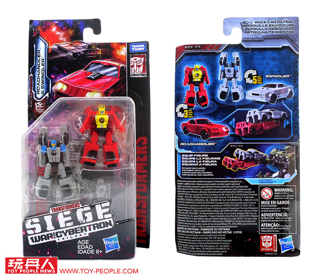 ▼WFC-S4「路行」(Roadhandler)與「騙徒」(Swindler),出自於G1同名的「賽車巡邏隊」(Race Car Patrol),可各自變形為龐帝克火鳥跑車(Pontiac Firebird)和迪羅倫DMC-12(DeLorean DMC-12),並合體為「多重機械粒子排氣加農砲」(Multi-Mech Particle Exhaust Cannon)。