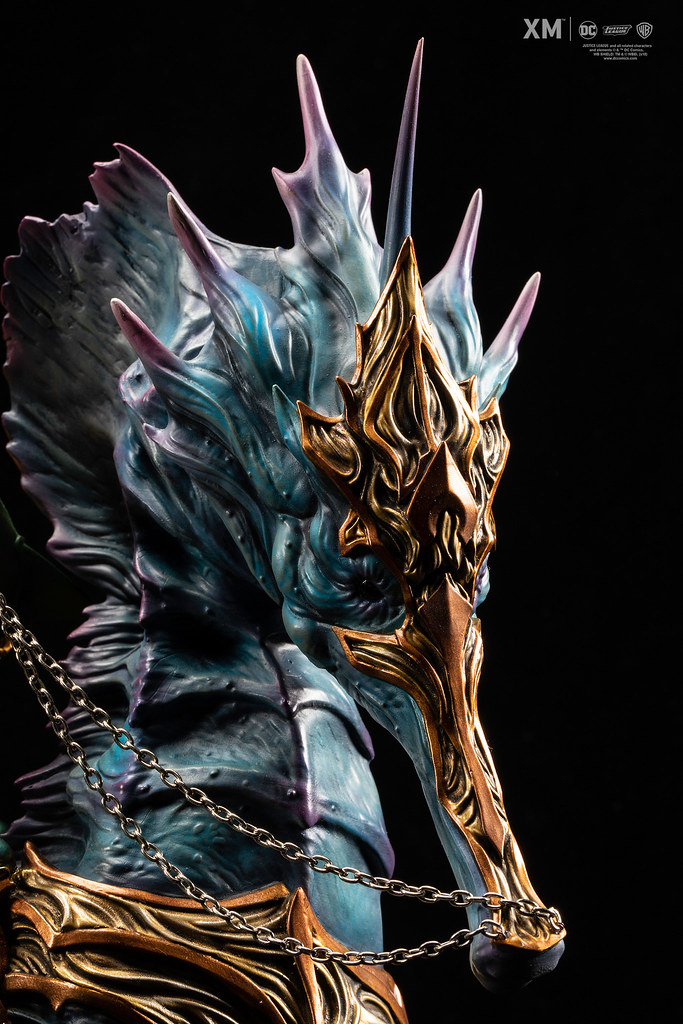一手拉著金屬鏈韁繩、一手持握三叉戟的水行俠還有留著長髮、蓄鬍的狂野頭雕可以替換;而本作另一個亮點絕對就是身形巨大的海馬「Storm」了!除了再現骨環、背鰭、蜷曲的尾巴......等海馬的動物特徵外,更施以極具生物感的漸層色彩,由靛藍色轉為紫色的變化十分出色,加上擁有精美雕紋的金色面罩、護甲、馬鞍配件更讓魄力大大提升;搭配有著珊瑚、魚群、斷裂石柱的場景地台,讓整體有著相當不錯的展示效果。