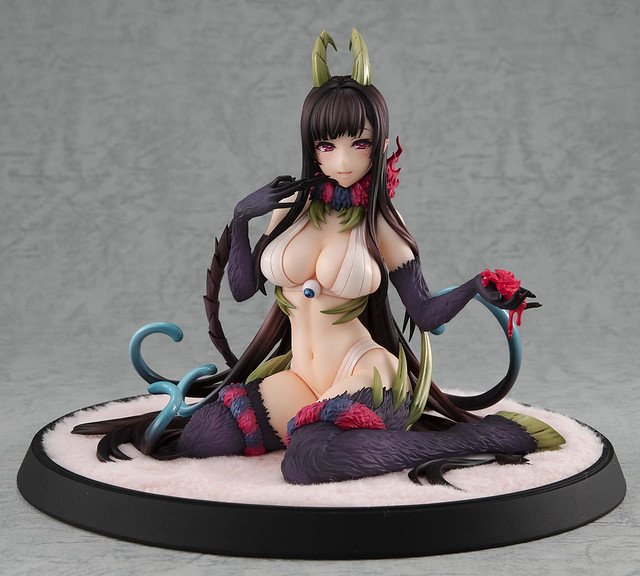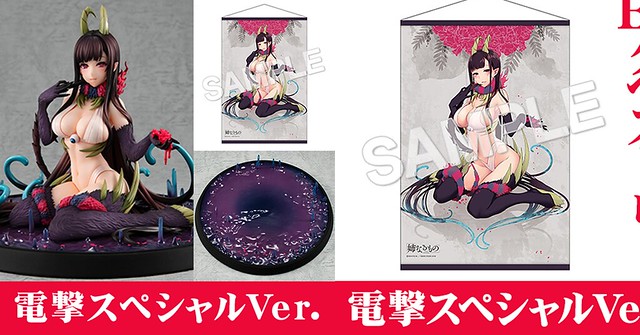 「千夜 1/8比例模型」以姊姊的惡魔姿態為基礎製作,豐滿的胸部、大腿造型忠實再現插畫家飯田ぽち。原畫中的肉感,視覺上相當柔軟。黑色的秀麗長髮施以細膩的漸層色澤,妖豔的眼神與笑容更增添色氣滿滿的氛圍,四肢毛髮也雕塑出毛茸茸的細節。此外於電擊屋販售的限定版更有竄出觸手的限定台座與 B2 原畫掛軸等超豪華特典!