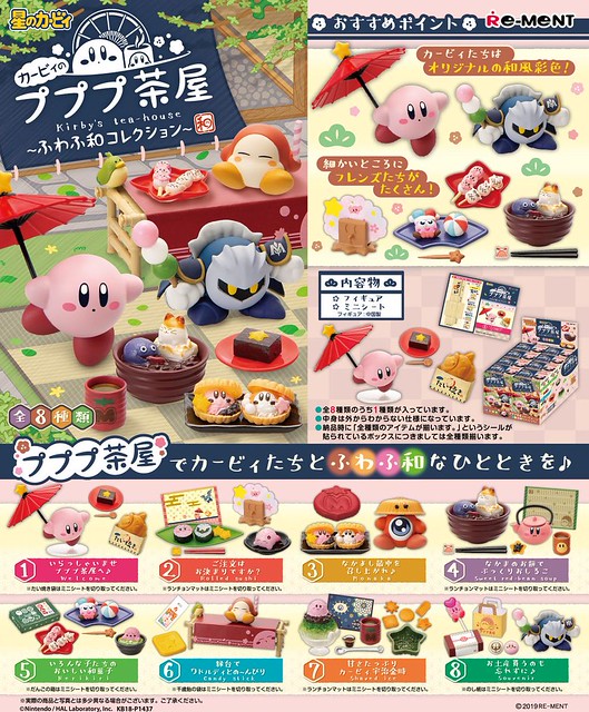2019年1月28日新增官方宣傳照片以及販售相關資訊,這次將以在茶屋有著悠閒吃美味和菓子為題材,連卡比也舉著充滿和風感覺的紙傘道具,各式的食物看起來也相當適合悠閒下午茶點,喜歡《星之卡比》的玩具人們當然要一次購入八小盒一中箱整套來收集的啊!喜愛《星之卡比》系列作品的玩具人可以參考一下歐!