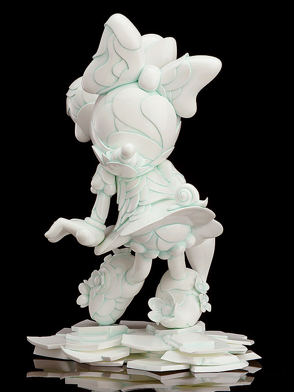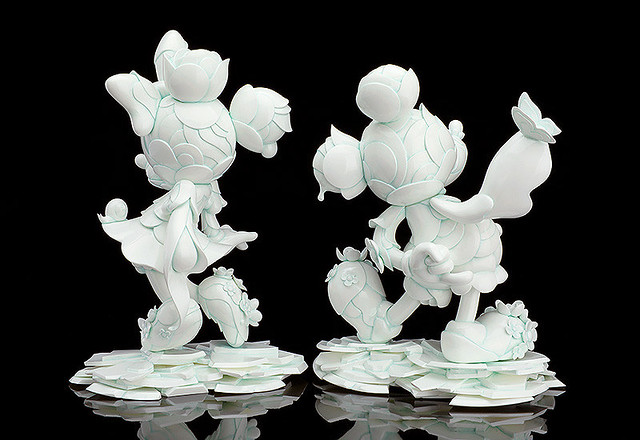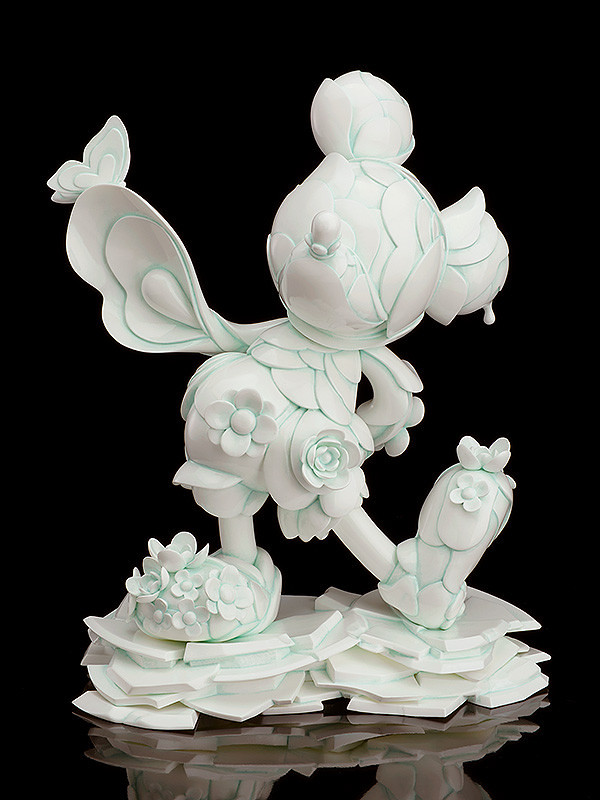 這款「米奇 & 米妮 90週年紀念雕像」可以稱作全高 25 公分的藝術品, JAMES JEAN 運用多種花朵、樹葉,甚至是蝴蝶、蝸牛等生物塑型成米奇與米妮的形象,讓人感受到來自大自然的清新、可愛。紋路看似複雜,卻猶如含苞待放的花朵般惹人憐愛。外觀更施以瓷器釉色般的白亮光澤塗裝,展現了每個曲面美麗的造型。