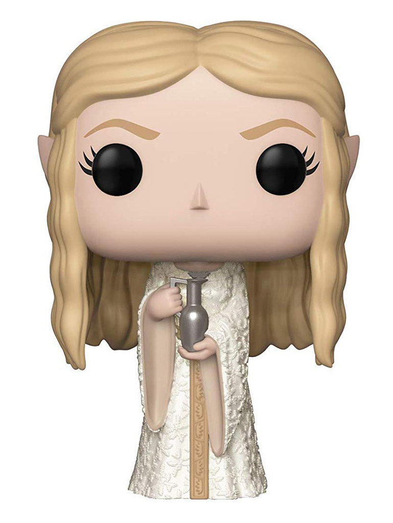 凱蘭崔爾是以她最廣為人知的白色長袍造型設計,除了波浪髮型外,長袍上的紋路更是細緻,加上手持銀瓶的姿態,整體給人既優美又可愛的視覺效果。