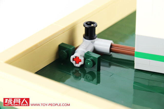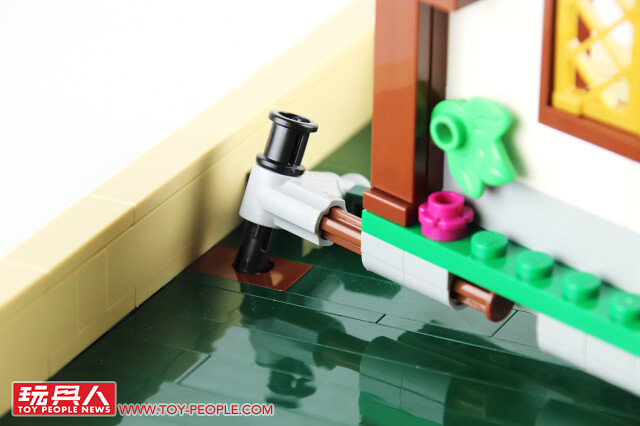 接下來就開始進入令人雀躍的精緻場景吧!組裝的方式非常簡單,只要將主要場景側邊的黑色插銷零件插入咖啡色的孔洞就輕鬆完成,輕鬆轉向、可伸縮的設計讓各位玩具人更容易操作,另外,還有簡單的固定設計。