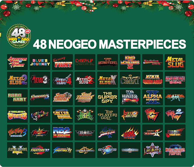 「NEOGEO mini 聖誕限定版」共收錄了 48 款遊戲,比起過去推出的 NEOGEO mini 還要多上 8 款,其中 9 款更是「NEOGEO mini」「NEOGEO mini INTERNATIONAL」都未曾收錄的作品!