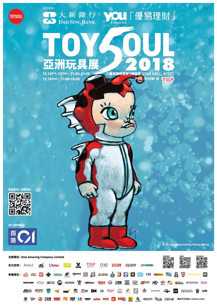 ▼由「kennyswork」的Kenny Wong 老師所設計的《亞洲玩具展TOYSOUL 2018》宣傳海報,今年的代表吉祥物是擁有獨特魅力的「魚童(YUTONG)」,而參展單位的陣容依然相當堅強呢!