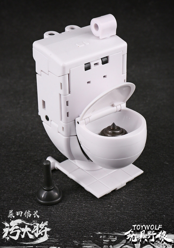 「汙大將 屎田信長」高約12 公分,武將型態有著極度惡搞卻意外帥氣的造型,身穿白色盔甲,四肢的關節、小腿、臉部以黑色零件製作,更是在鬼面頭盔的各部件點綴著金色邊框提升豪華感(?),腹部、背部還印製了「屎田」的家徽,藉著豐富的可動機構,即可展現各種霸氣又逗趣的戰鬥姿態!而且當你的便意來襲時,屎田信長能立馬變形為中規中矩的白色馬桶供你使用,還附贈馬桶疏通工具唷!