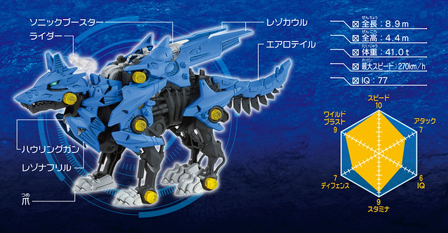 「ZW16 機動獵狼」擁有強大腳力的中型 ZOIDS,奔跑的速度可達音速,據說地上被復甦的機動獵狼會朝遠方長嚎,對地底的同伴骨骸引起共鳴之風。玩具能透過馬達一邊開閉口部一邊前進,最特別的是有兩種本能解放型態,第一型態是將背部羽翼舉起轉換成高速模式繼續前進,第二種則是將羽翼和推進器轉向前方,推進器的前端開始旋轉,施展出必殺技「Howling Shout」!