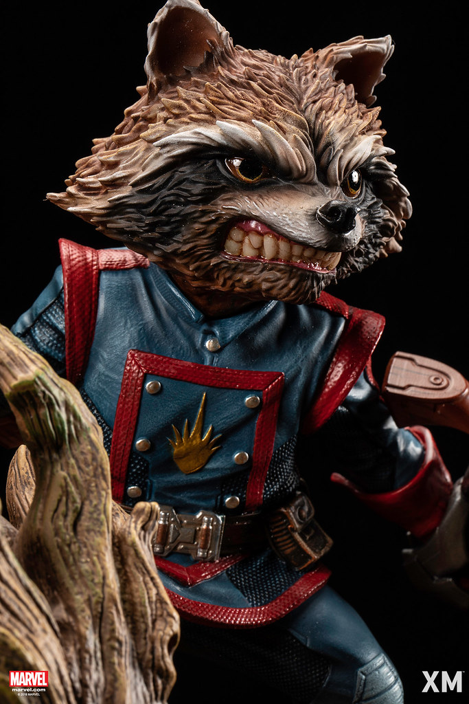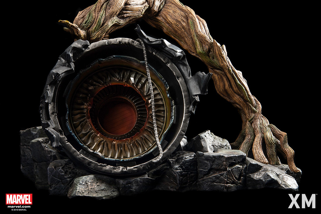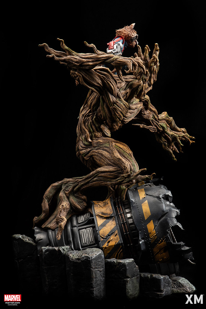雖然呈現出咬牙切齒的兇狠表情,但迷你的身軀、毛茸茸的尾巴,加上水汪汪大眼讓火箭整個超萌呀~毛皮質感、牙齒、鼻子都展現了高度造型力!再來就是伸長左臂、呈現攻擊態勢的霸氣格魯特,白色雙目使他怒吼的表情更加兇猛,XM Studios 設計團隊精湛的雕刻、塗裝技巧在格魯特的軀體上展露無遺,除了樹木紋路外,部分的青綠上色更是大大提升逼真感,地台是以毀壞的飛船渦輪部件為題製作,可以跟「星爵」搭配展示;除此之外,還附屬了火箭專屬的底座,讓他不只能站在格魯特肩膀上,單獨展示也很可以!