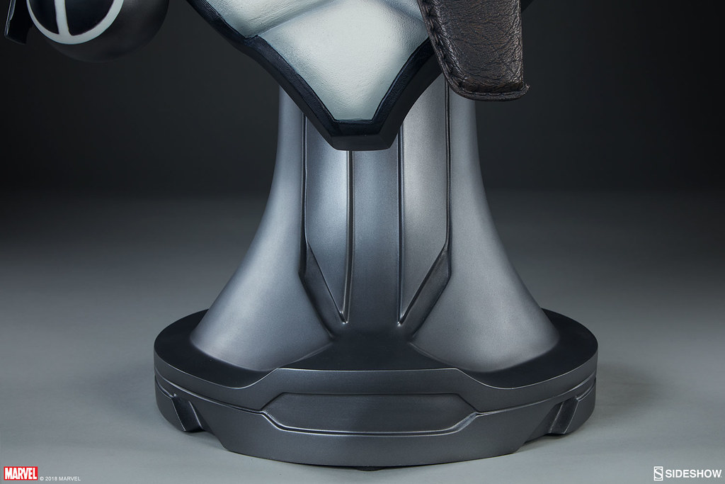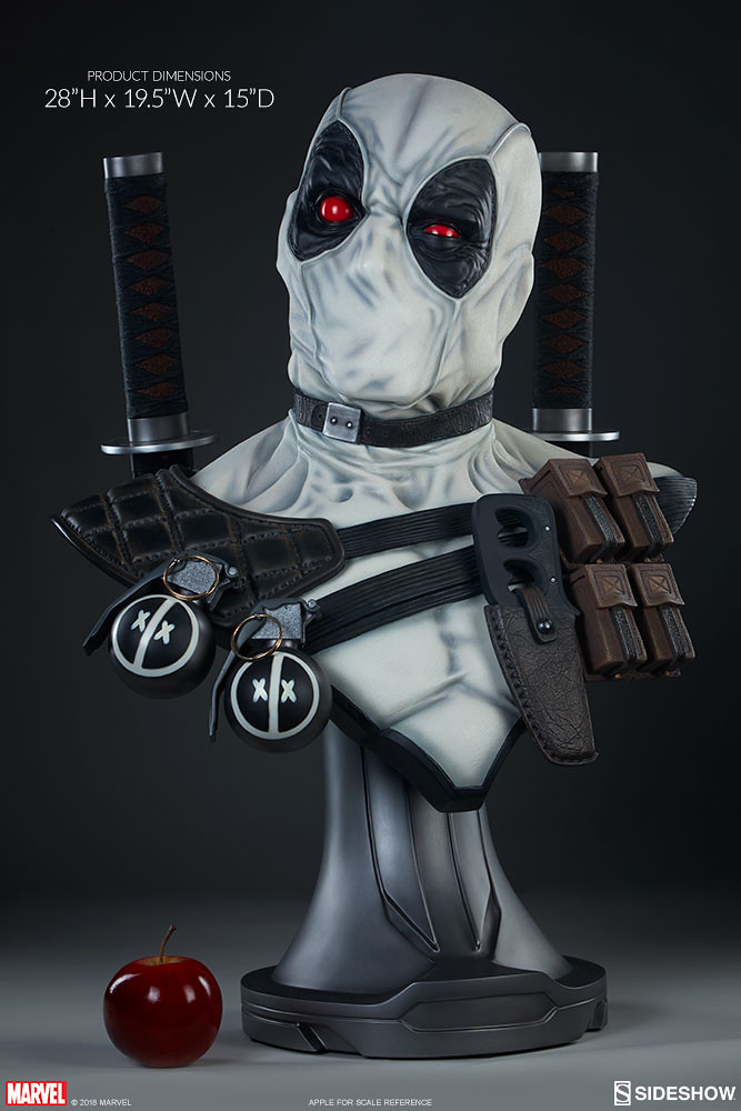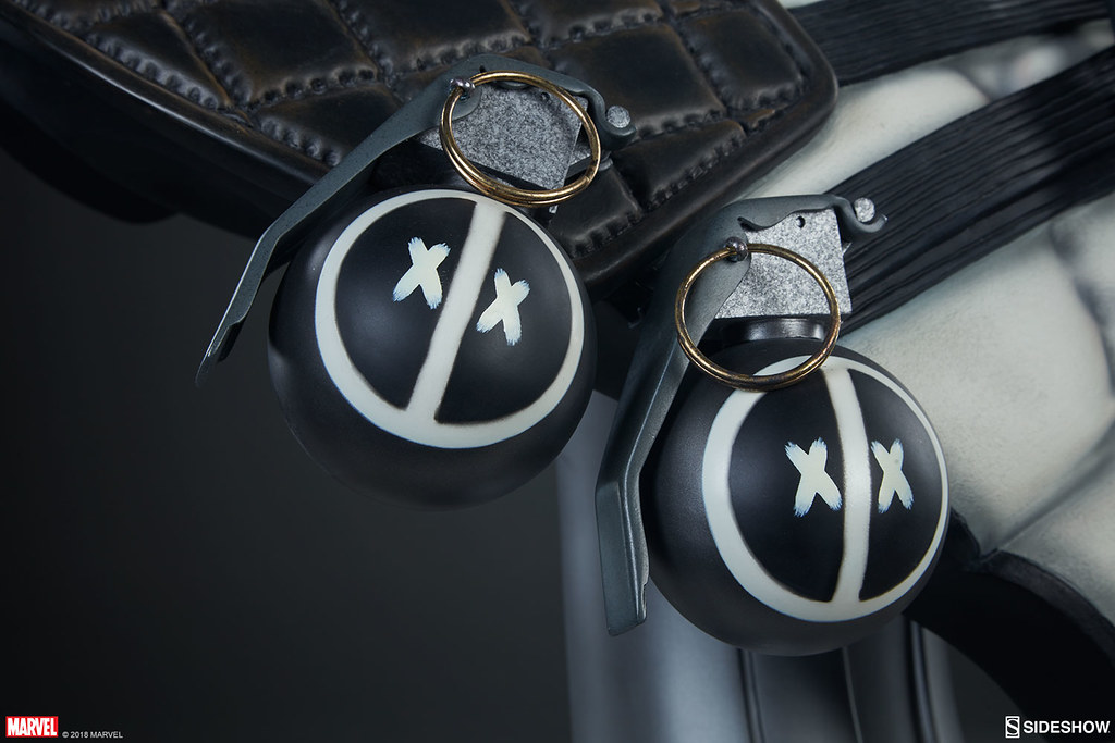 「死侍 X特攻隊 1:1 比例半身胸像」高約71 公分,以大小眼的設計完整表達出死侍愛胡鬧的性格,血紅的雙眼更是增添他的瘋狂氣息,灰色頭罩、緊身衣的皺褶在陰影效果的塗裝襯托下更為寫實,搭配的裝備也讓本作擁有豐富的視覺效果,背後的雙刀刀柄、頸圈、彈夾袋、刀套、格紋黑色墊肩,以及兩枚具有死侍淘氣風格的手榴彈!要跟超級英雄自拍?找他就對啦XDDDDD