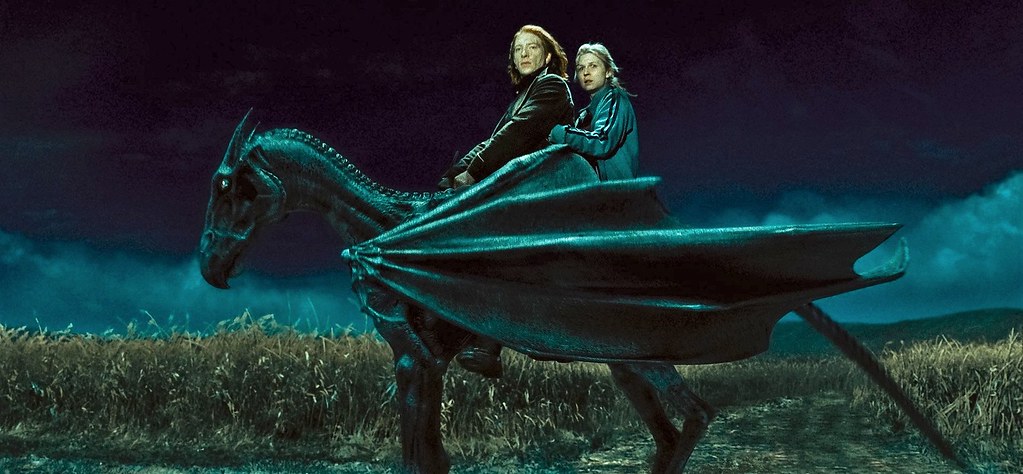 故事一開始要把葛林戴華德從美國轉送到歐洲時,我們能看到護送隊伍的馬車其坐駕為「騎士墜鬼馬」(Thestral),又稱夜騏。這生物是天馬的一種,外表上長著龍的頭與脖子,骨骼嶙峋、身軀高大、背上有一對翅膀,而只有看過死亡的人才能看見這種天馬,為此從這部電影登場的主要角色幾乎都可以看到這生物這點來看,代表著他們的過去一定相當恐怖或者悲慘,而這更凸顯了此部電影的黑暗調性~