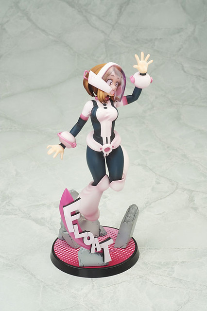 故事設定裡面「麗日御茶子」就讀於雄英高中英雄科1-A班,因為她家經營著建築公司不過業績慘淡無比,所以她的目標是成為英雄後賺很多錢,讓父母可以過上比較輕鬆的生活。此次一樣是以其身穿戰鬥服的造型來呈現其立體作品,底座部分也有漫畫當中常出現的英文狀聲字樣裝飾,另外還附有沒帶頭部護具模樣的頭雕配件可以替換來呈現御茶子不同的樣貌,喜愛《我的英雄學院》系列作品的玩具人可以參考一下歐!