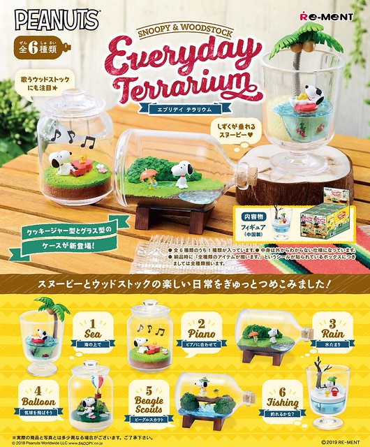 2019年1月23日新增官方宣傳照片以及販售相關資訊,這次將繼續以「水晶瓶(Terrarium/ハッピーテラリウム)」系列來推出其"Everyday Terrarium",「Terrarium」原來的意思是指在玻璃箱裡面來種植植物,這次將史奴比與金絲雀WOODSTOCK兩人的日常生活出現的情境,來放置於Terrarium 容器當中,預計將推出約有六款不同主題的樣式可以收藏,喜愛《史奴比》系列的玩具人可以參考一下歐!