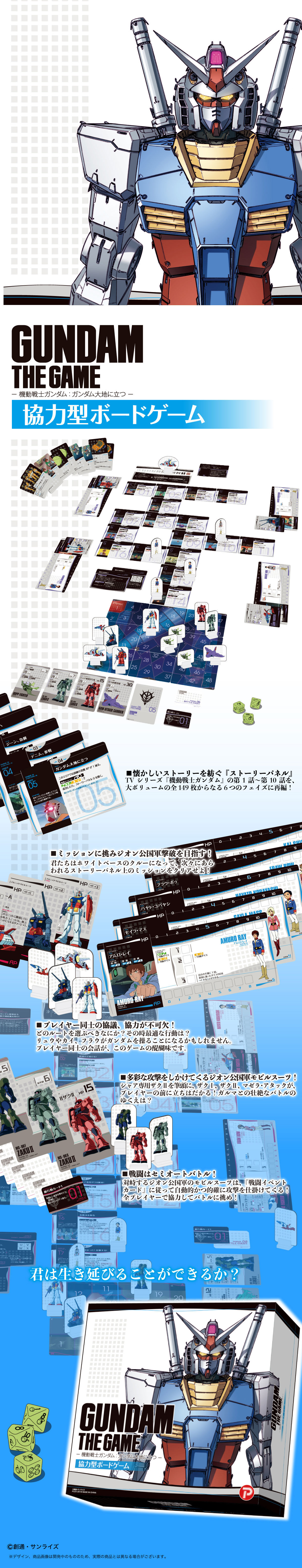 『GUNDAM THE GAME 機動戰士鋼彈:彈矗立於大地之上』的故事由動畫《機動戰士鋼彈》的前 10 話構成,遊戲收錄了多達 149 種的故事板、30張角色立牌、38張 MS/ 機械卡、40張戰鬥事件卡...等豐富的內容,而且沒有複雜的規則,只需要依照卡片上的指示行動,不論是熟悉《機動戰士鋼彈》的粉絲或是從未接觸鋼彈系列的入門者,都能透過簡單易懂的教程輕易上手這款遊戲!