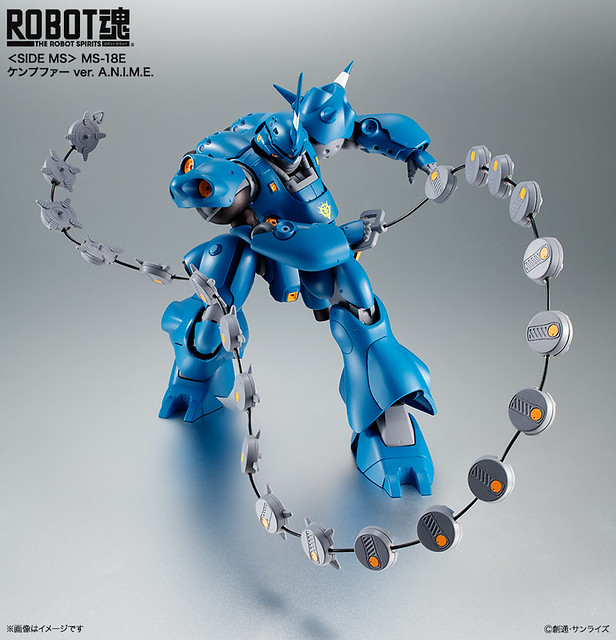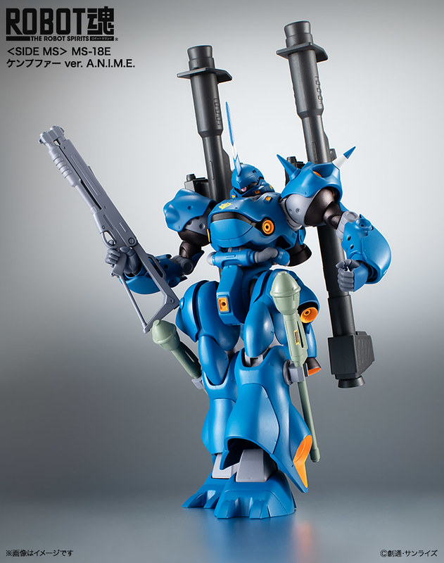 「MS-18E 肯普法 ver. A.N.I.M.E.」重現動畫中由出渕裕設計、洗練而美型的圓滑裝甲造型,並結合 ROBOT 魂系列出色的可動關節設計。機身印有吉翁軍徽與獨眼巨人隊徽,特徵的推進器、噴嘴能裝上噴射特效零件。商品中還包含了光束軍刀、雙型火箭炮X2、鐵拳X2、爆雷鏈、霰彈槍等大量武裝以及射擊特效零件,能再現一擊脫離的高速強襲戰法以及高火力的重擊裝備型!