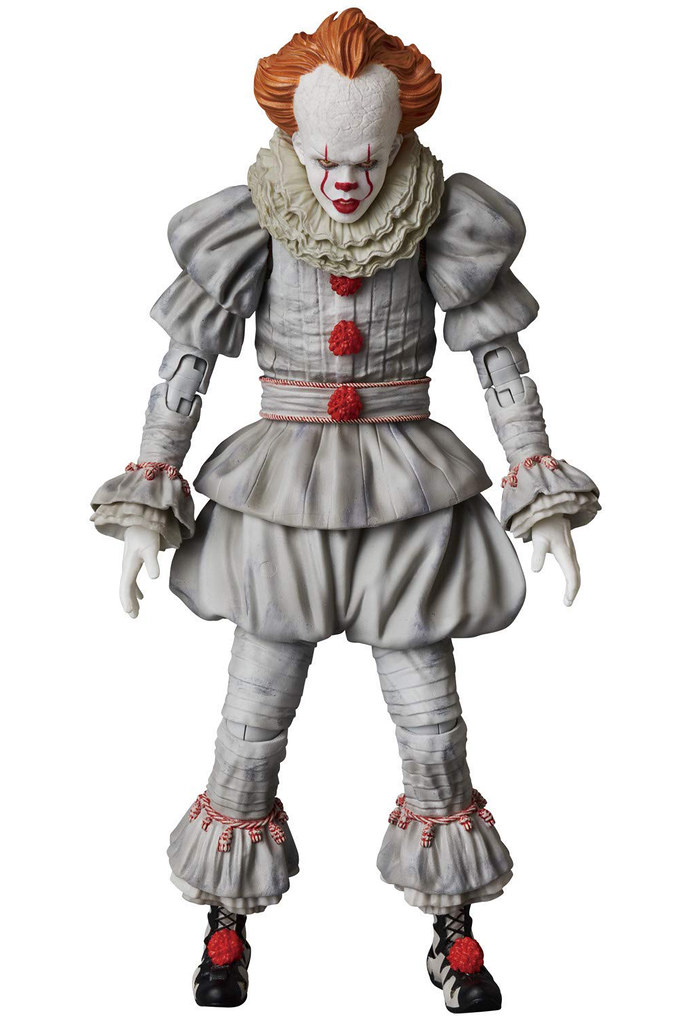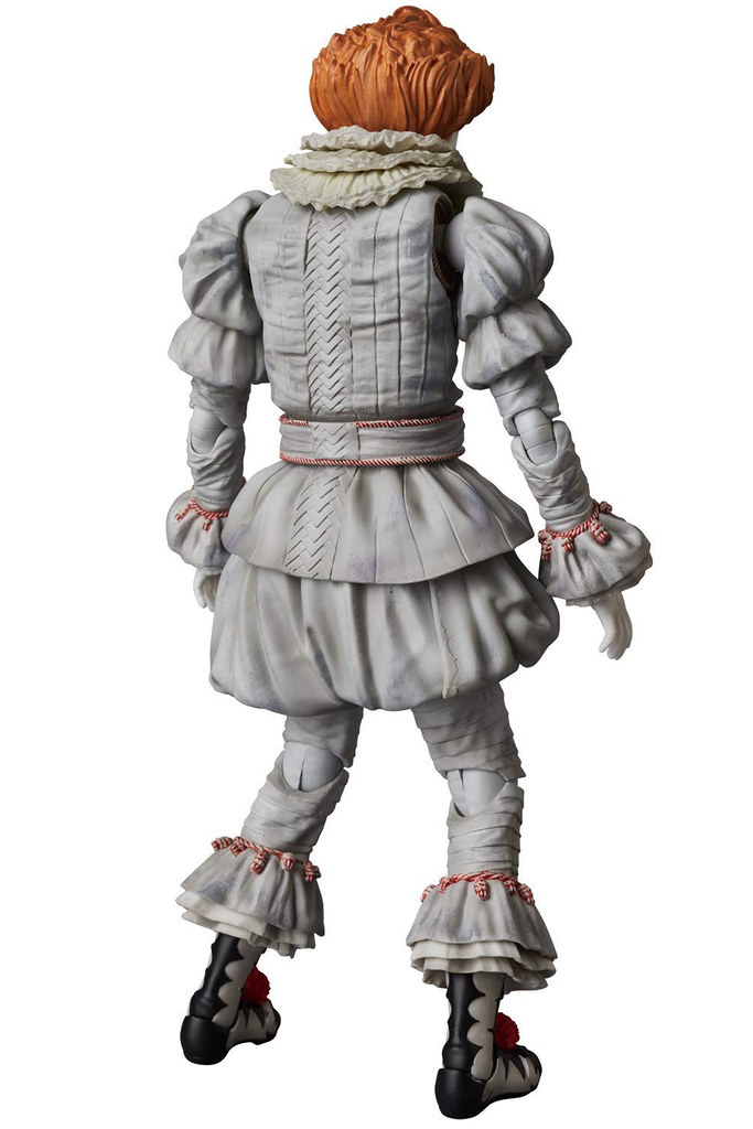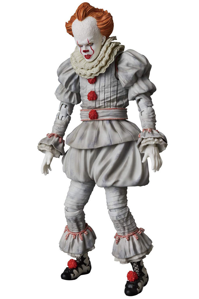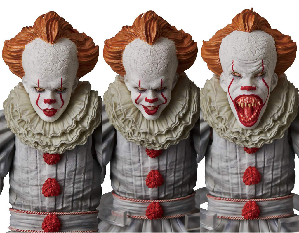 「MAFEX 潘尼懷斯」高約16 公分,逼真地再現了潘尼懷斯的劇中造型,頭雕刻畫尤其精彩,橘色頭髮、寬大額頭的皺紋、小丑妝容都很精緻,那笑容更是散發出令人不寒而慄的氣息,共有普通、奸笑、準備要吃人的恐怖狀態三種表情,服裝的多層皺摺、荷葉邊、紅色彩球等裝飾都施以高度造型力,寫實的陰影效果塗裝更加深了牠帶給人們的恐懼,配件附屬紅氣球、小喬治的紙船與多個替換手型,讓你展現各種牠的經典姿態!!