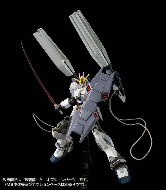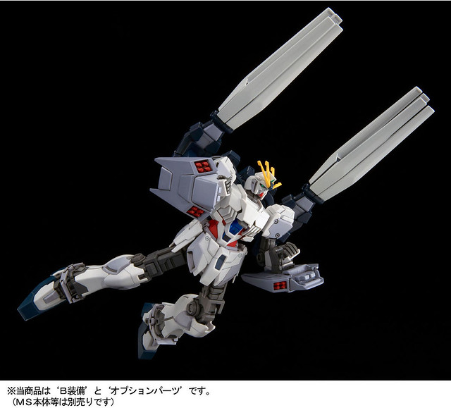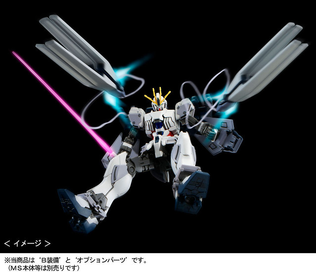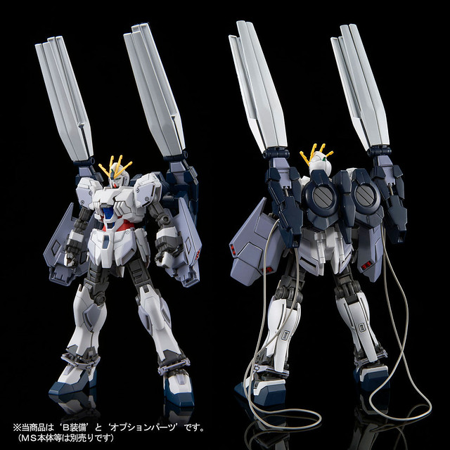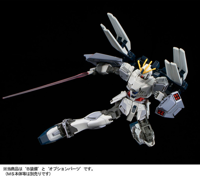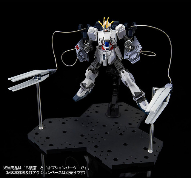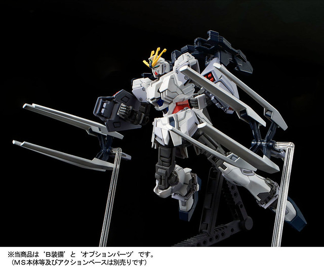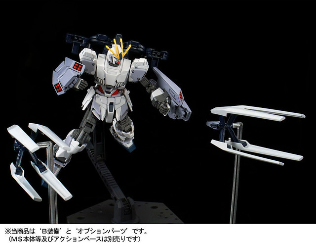 「HG 1/144 NARRATIVE鋼彈 B裝備擴充套件」收錄了有線式遠隔攻擊系統的背包、腕部的小型盾牌與支架,能與另售的 NARRATIVE 鋼彈本體組合,透過超長的纜線重現有線式遠隔攻擊的姿態,或是用輔助零件與支架再現「NT-D」發動後的感應砲型態!