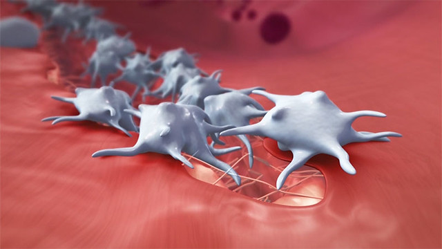▼ 抱歉放錯圖,實際上的血小板是長這樣的!血小板受到刺激活化後,會從雙凸盤狀的體表伸出不規則的足突,黏附在血管受損的內壁,並靠著血小板彼此的橋接聚合,與纖維蛋白、凝血酶...等凝血因子形成血塊,堵住傷口達成止血。