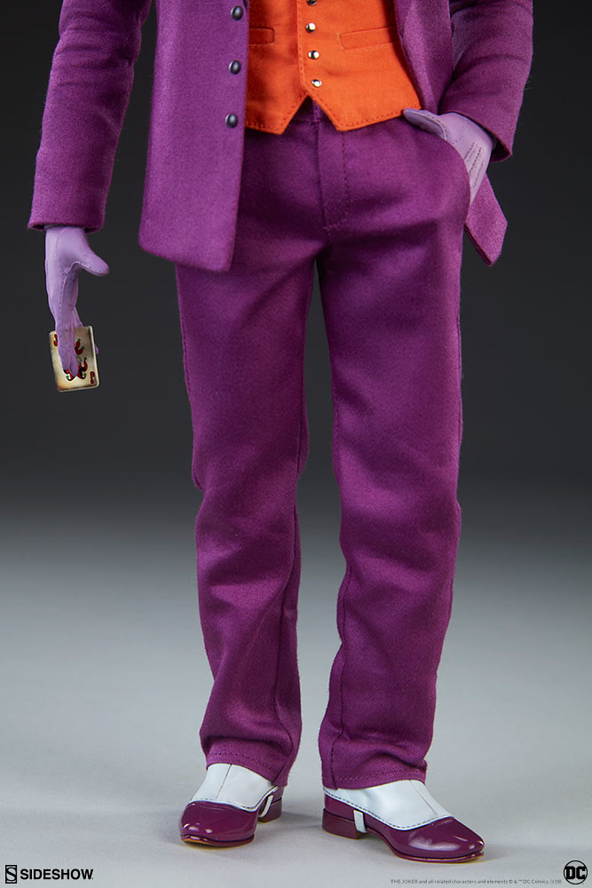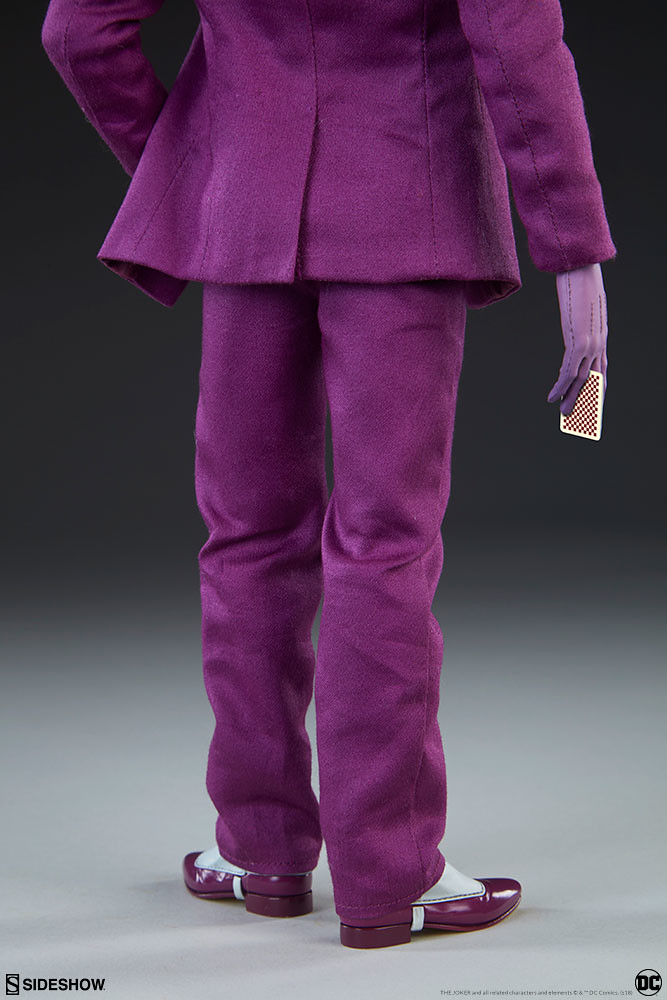 「小丑 1/6 比例人偶」高約30.4 公分,身穿合身的菖蒲紫色西裝,亮橘色背心與綠色領結讓整體造型更加搶眼,左胸的胸針花、淡紫色手套更讓人感受到他的講究,頭雕表現也十分出色,綠色頭髮、眉毛與紅唇在蒼白面貌上形成鮮明對比,因為猙獰表情而產生的皺紋細節和雙眼的煙燻妝容則大大加深了小丑帶給人的不安、緊張感,臉孔在光影效果的加強之下,擁有非常強烈的視覺效果!