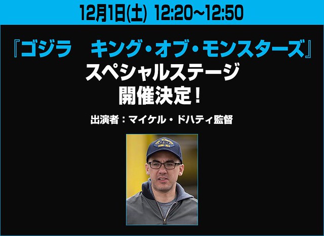 12 月 01 日當天,麥可·道格堤導演將於日本時間 12:20-12:50 於 COMIC CON 主舞台進行特別訪談節目並公開《哥吉拉2:怪獸之王》最新 60 秒影像。隨後在 BANDAI SPIRITS 公司收藏玩具事業部「TAMASHII NATION」攤位也會首度公開出自《哥吉拉2:怪獸之王》的 S.H.MonsterArts 系列作新商品與2公尺哥吉拉立像!此外,當日 10:00 進入會場就能獲得限量 3000 份的《哥吉拉2:怪獸之王》B3 海報!