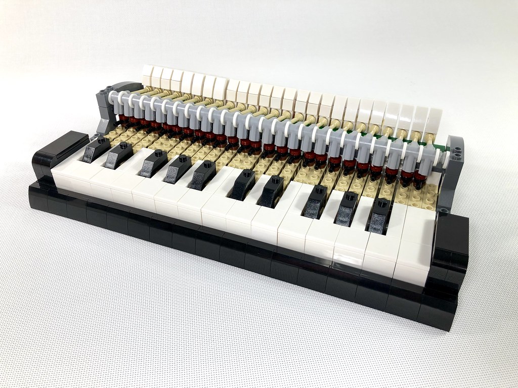 而這台鋼琴的一大亮點就是擁有可彈奏的鍵盤!在影片裡Donny 有將整個鍵盤組拿出來實際示範,共有25 個琴鍵,每一個琴鍵都有相對應的琴弦跟琴槌,踏板也有連動機構!他表示最花時間的就是在可彈奏設計的這一部分,因為Donny 本身也相當熱愛音樂,經常會想用樂高堆砌出一座鋼琴,加上他常被學生問到鋼琴內部究竟是如何運作,所以他想打造一個自己的版本!(這...成品非常地驚人呀~)