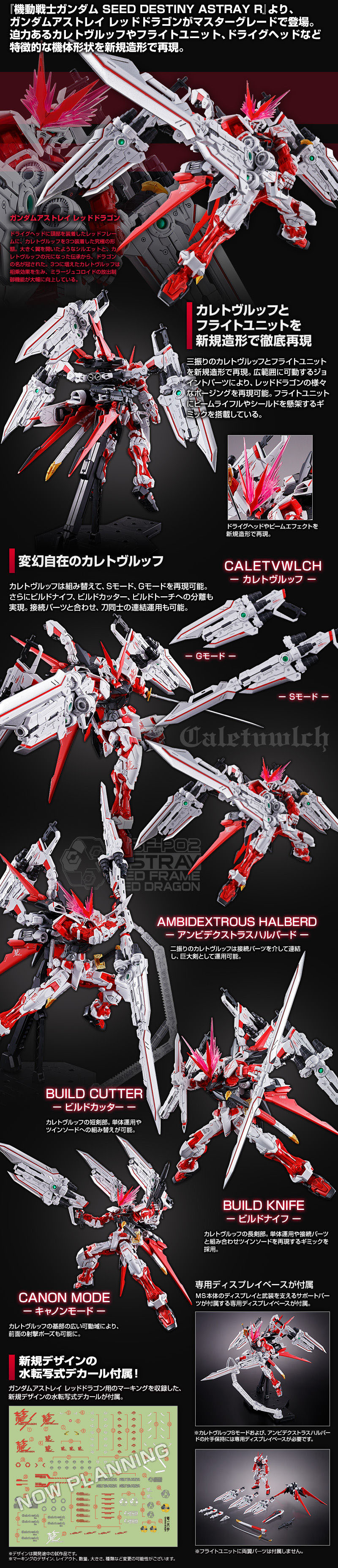 由日本 BANDAI SPIRITS 公司 HOBBY 事業部發行,搭配著最新技術、分件完整且高度可動的鋼普拉「MG(Master Grade)」系列繼「異端鋼彈逆紅色機」後,今(03)日再度發表了出自《機動戰士鋼彈SEED DESTINY ASTRAY R》的最新商品「MG 1/100 異端鋼彈紅色機 紅龍型」預計於 2019 年 02 發售的消息。此商品僅在官方網路商店「PREMIUM BANDAI」限定販售。