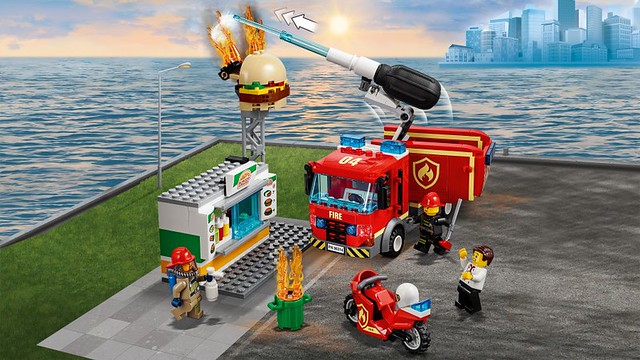 這組小編覺得很值得收呢!先來看看場景,是一個擁有完整造型的速食小店,招牌、菜單、醬料等裝飾讓門面看起來頗為豐富,一旁還有高高架起來的漢堡模型,而消防員這邊則有搭載全新幫浦零件的消防車與紅色機車,裝載噴水裝置的部分還設置可動機構,不但可以轉動,還能將噴水裝置的高度抬升!