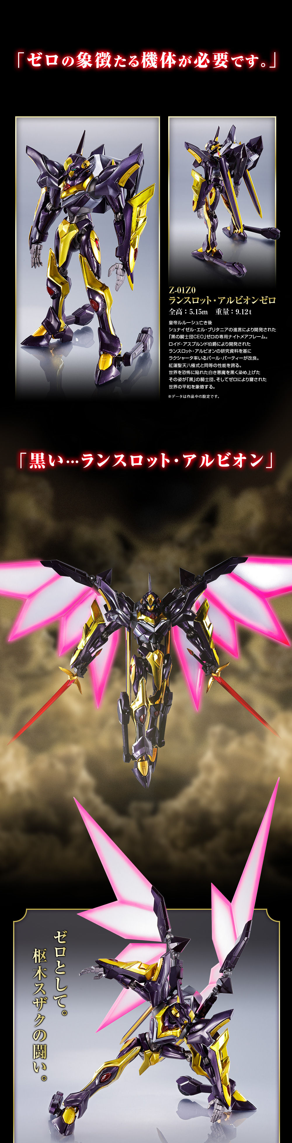 由日本 BANDAI SPIRITS 公司收藏事業部發行,結合厚重金屬質感、高度造型力、可動結構的「METAL ROBOT魂」系列繼「蘭斯洛特.阿爾比昂」、「紅蓮聖天八極式」後,再度發表了出自劇場版動畫《CODE GEASS 復活的魯路修》的最新商品「蘭斯洛特.阿爾比昂 ZERO」預計於 2019 年 05 月發售的消息。