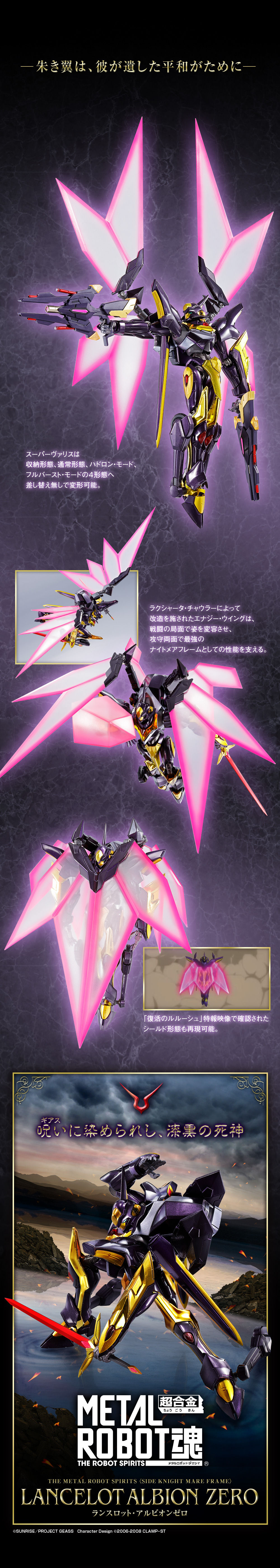 「METAL ROBOT魂 蘭斯洛特.阿爾比昂 ZERO」在本體沿用了前作「蘭斯洛特.阿爾比昂」的造型與結構,同樣具備豐富的武裝、出色的可動及「SUPER VARIS」四段變形等機構,而能量翼裝備則是完全新規造型,能重現劇中攻守兼備的可變骨架。