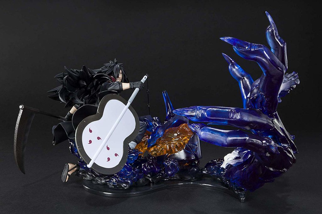 本作呈現出手握團扇和鐮刀的斑朝著前方進攻的戰鬥姿態,紅色軍甲、長髮都形塑出飛舞的動感,左邊的寫輪眼、緊身衣的皺褶、頭髮、鐮刀刀片的材質和團扇的戰損......等諸多細節都考究地再現,場景則是以半透明材質製作的九尾一部分頭部和手臂,雖不是完整造型,但那銳利指甲和狂怒眼神使其人依然能感受到其兇暴的魄力,裝備在九尾身上的深藍色須佐能乎裝甲施以精緻的漸層上色,其餘不規則形狀的實體化查克拉更為本作增添流動感!搭配「千手柱間 -木龍- 絆Relation」即可再現這場壯闊的對決。