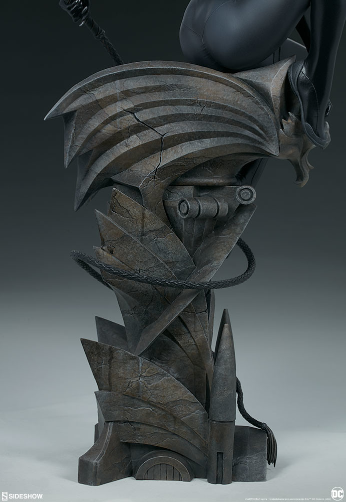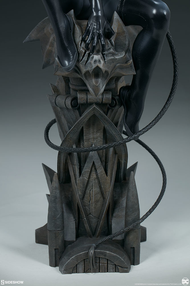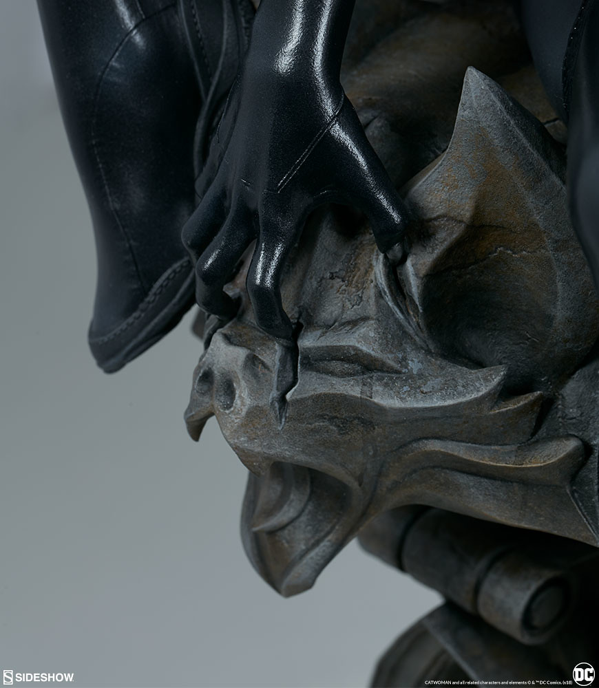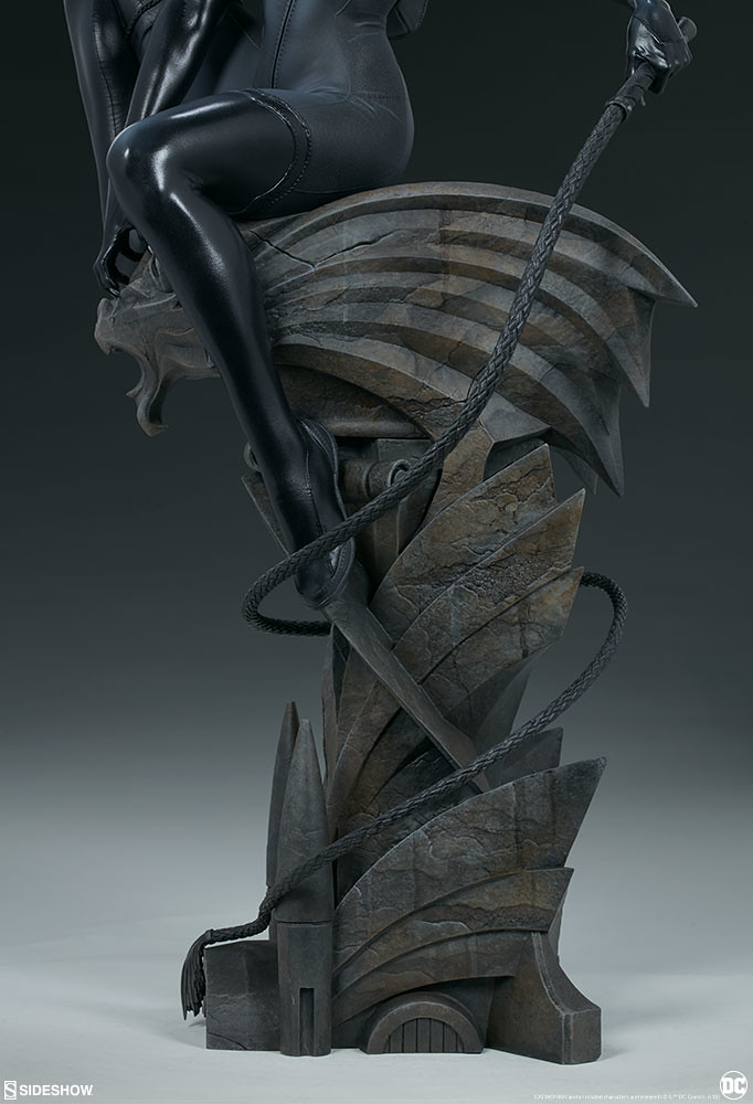 「貓女 1/4 比例全身雕像」高約55.8 公分,呈現出瑟琳娜坐在蝙蝠石像上的輕盈姿態,玲瓏有致的身形曲線被精彩地形塑,黑色緊身衣有著寫實的皺褶、縫線細節,四肢的護套有著亮眼光澤,展現出截然不同的材料質地,護目鏡置於額頭,露出略帶狡猾神情的微笑,後背包還有包含蝙蝠標誌、頭像元素的驚喜設計,左手握著皮鞭,右手的貓爪則嵌進石像,還造成了深刻的痕跡超驚人;EX版中更追加了一個戴著經典造型面罩的替換頭雕。