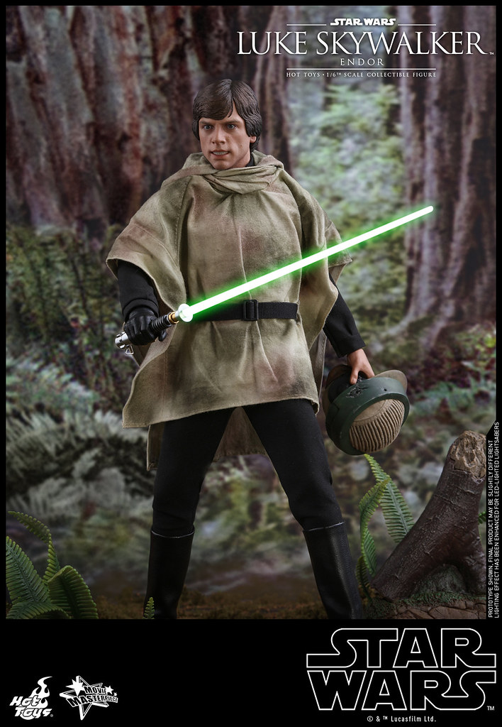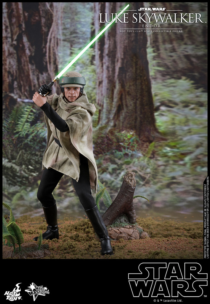 本作高約28 公分,全身共計30 可動,整體服裝是根據電影中路克在恩多星時的造型所設計,身穿黑色長袖上衣、長褲、仿皮長靴,披著迷彩圖樣、帶有偽裝功能的連帽斗篷,帥氣的突擊隊頭盔與頭髮配件具備磁吸功能可以輕鬆拆卸,頭雕是由天才頭雕師Kojun 操刀製作,搭配E-Lee 與JC. Hong 的塗裝技巧,逼真地再現了「馬克·漢米爾(Mark Hamill)」當時堅定的表情神韻,配件部分附屬手槍、光劍柄、結合右前臂的可發光光劍柄,以及正常跟揮動型態的綠色光劍!展示地台還以恩多星的環境製作喔!