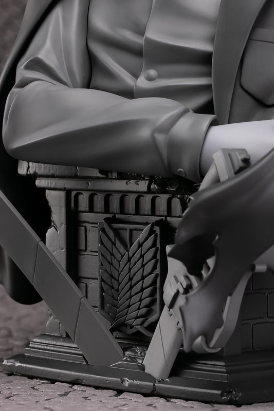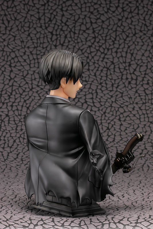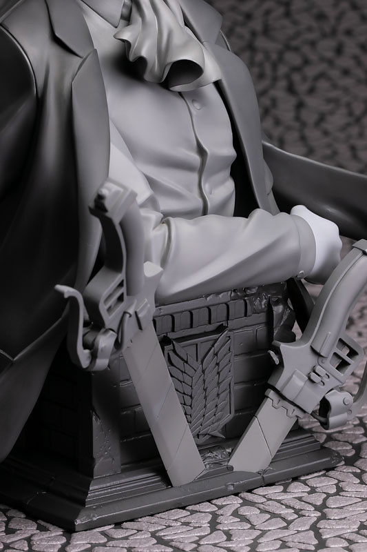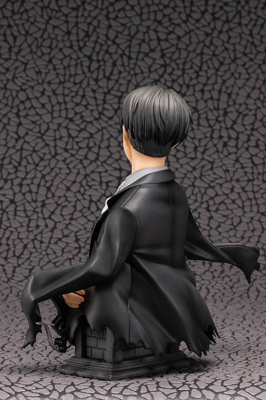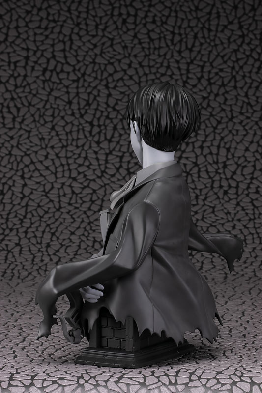 「里維.阿卡曼 胸像」全高約 250mm, 以 1/3 比例打造身穿帥氣黑西裝、露出不屑、厭惡感銳利眼神的里維兵長,不僅臉部表情刻畫細膩,服裝也具備複雜的皺摺造型並透過塗裝呈現光影效果,底座則是結合了城牆、調查兵團徽章、兩把劍等表現原作世界觀的元素,象徵著為樂園內人們的自由而戰的精神。此商品共有彩色版、原型灰版兩種版本,不同的色彩呈現出不同氛圍,都相當帥氣!