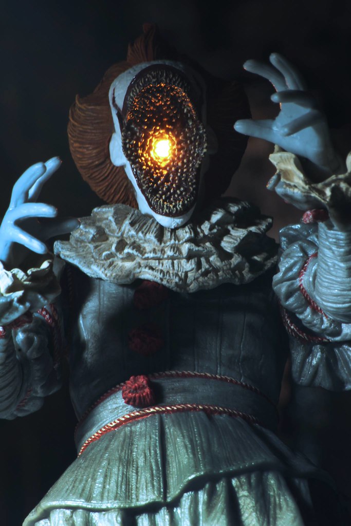 「終極"跳舞小丑"潘尼懷斯 7 吋人偶」高約17.7 公分,除了有豐富的頭雕陣容外,還附屬了恐怖的變形手配件!頭雕包含四種,凶狠臉、從恐怖的畫"Judith"變來的扭曲臉(這個真的可怕)、張開整個臉並散發出Deadlights 的變形臉,而且真的有搭載LED 可發光,以及牠跟魯蛇俱樂部打鬥時,從嘴裡竄出許多燒焦噁爛手的狀態,詭異的造型與塗裝都十分到位!另外,超具份量、有如深海生物的尖刺替換手配件也很讚,攻擊性十足呀~當然也有正常版的替換手囉。