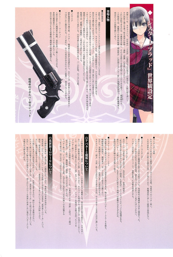 《SISTER BLOOD(シスター・ブラッド)》 是由曾為新海誠《秒速5公分》、《你的名字》等多部作品撰寫小說版的作家加納新太原作、Tony 擔任插畫設計的小說作品,於 Tony 發行的同人誌《Tony MAGAZINE》連載。 2117 年,人類遭受能奪去肉體與靈魂的異世界怪物「惡魔」威脅,遍及全世界的組織「神託教會」則集結了能夠召喚守護靈借助其力量的「驅魔師」狩獵惡魔。在至今仍殘留百年前「大災害」傷痕的都市 - 新橫濱中,有位身手不凡的驅魔師「緋野魔璃亞」正在活躍著...。