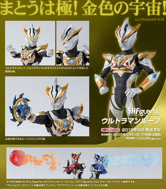 劇中第15話"まとうは極"篇由 超人力霸王Rosso 與 超人力霸王Blu 兩位所合體最強之姿態「超人力霸王羅布(ウルトラマンルーブ)」,作品附有交換用手首左右各4種、六枚利刃包覆的圓環武器「羅布光輪(ルーブコウリン)」,以及「超人力霸王Rosso 火型態」與「超人力霸王Blu 水型態」可以使用兩款特效配件,此作將於Premium BANDAI在2018年12月14日開始接受訂購,喜愛《超人力霸》特攝劇集系列的玩具人可以參考一下歐!
