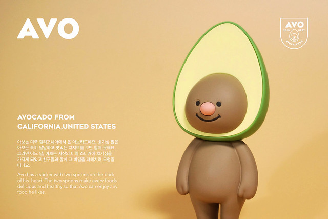 AVO FRIENDS 是於2018年5月正式成立的藝術工作室,特別喜愛酪梨的設計師HYO 首先創作了AVO 這個角色(上圖設計師手裡握著的就是AVO),也因為對蔬菜、水果的愛好,於是陸陸續續有了其他角色如:APPIE、BANA、ONIE......,她也會將蔬果本身的特色、產地貼紙上的資訊轉化為角色的設定,每位角色都擁有自己的性格與小故事~所以她也為立體化的玩具們製作了可以貼在後腦勺的貼紙,是相當可愛的設計呢!