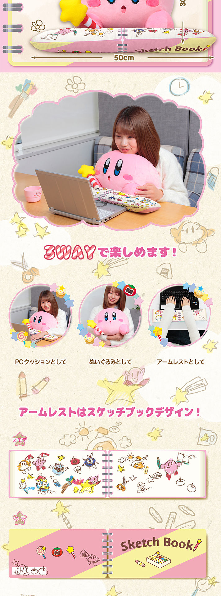 「PC CUSHION 卡比抱墊玩偶」將手持星之杖的卡比製作成可愛療癒又實用的抱墊玩偶,圓滾滾的卡比布偶擁有柔軟彈性與柔順布面,抱起來相當舒適。素描簿造型的手靠墊上則有可愛的繪畫圖樣,和布偶就結合起來就能讓你一邊抱著卡比、一邊在電腦前工作。可愛的造型不但能洗滌疲勞的心靈,還能減輕打字時手臂的負擔,對於忙碌的你來說應該非常抒壓呀~!