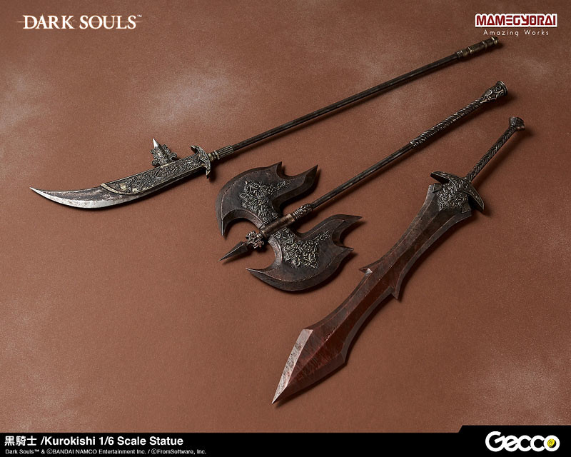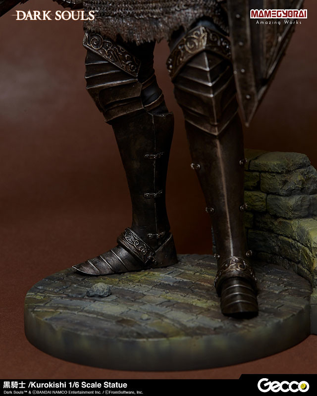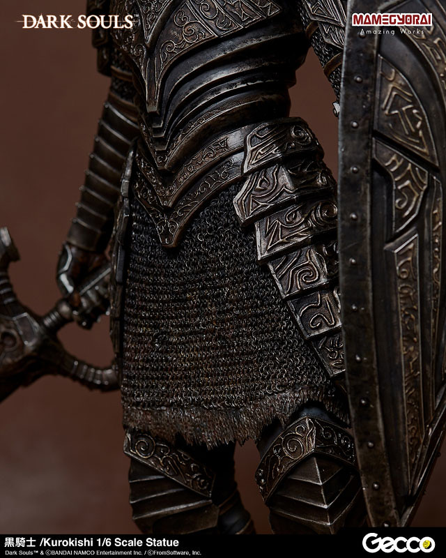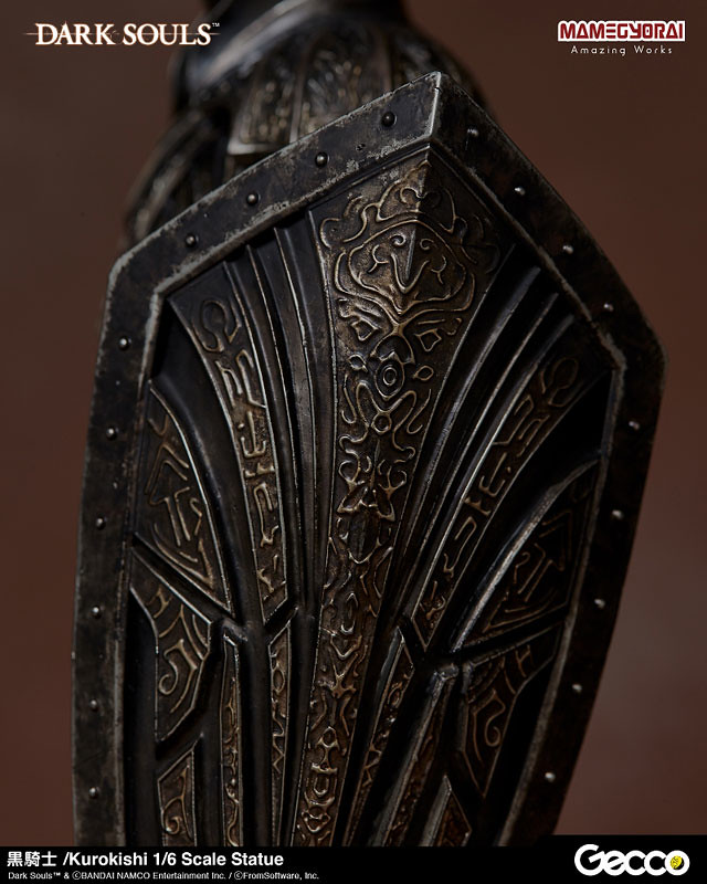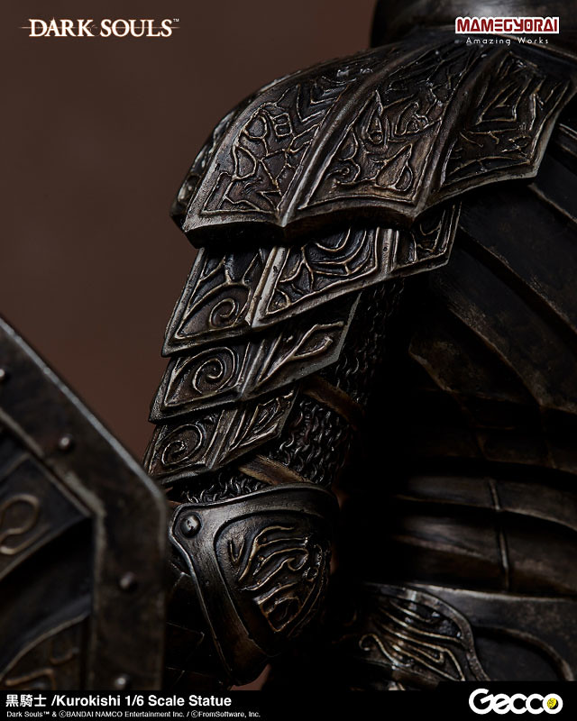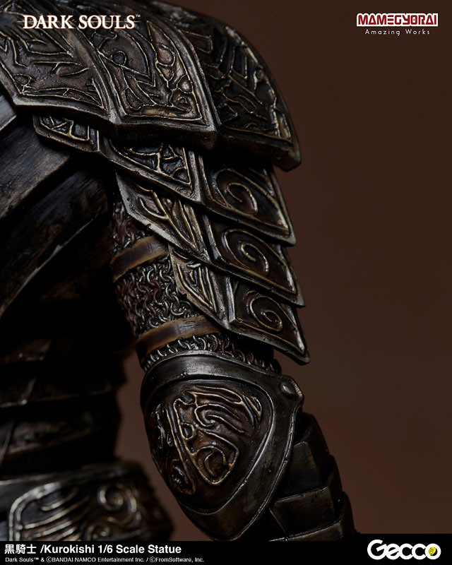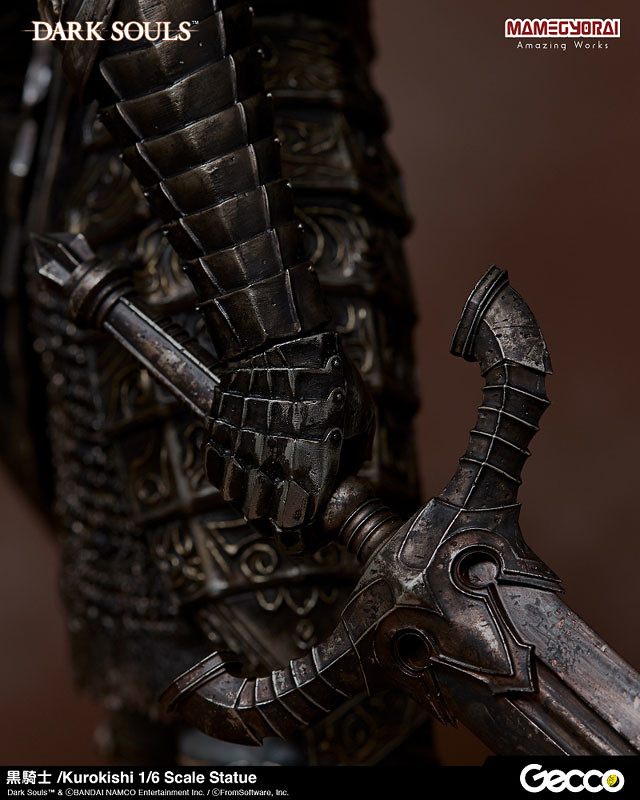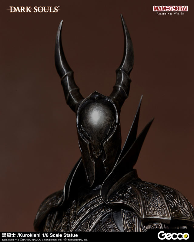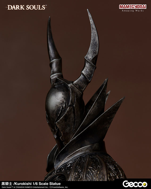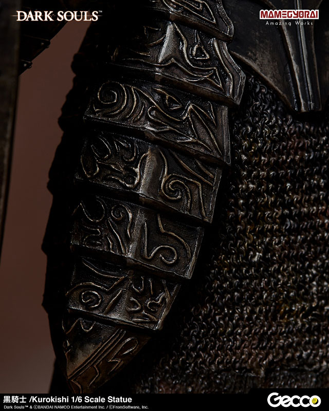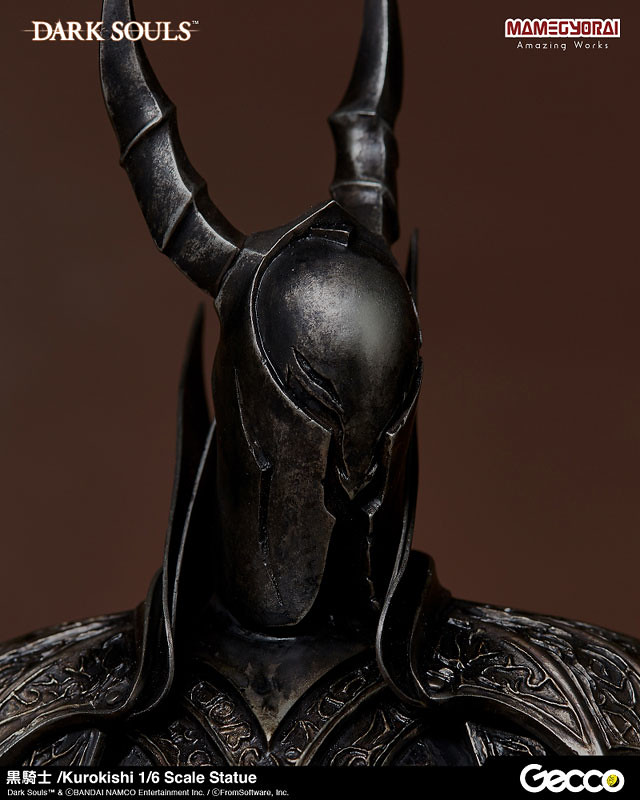 「黑騎士 1/6比例雕像」由山岡真彌擔任原型製作、明山勝重(-accent-)負責塗裝並交由 From Software 設計團隊完全監修,將融入「火」、「灰燼」、「燃煤」等象徵作品概念要素的鎧甲精緻再現,細膩打造出複雜的鎖子甲和雕紋、燻黑的色澤,表面擁有極度真實的金屬紋路,同時還施以舊化的鏽痕,雙眼更設有 LED 燈發光機構,擁有壓倒性的氣勢!