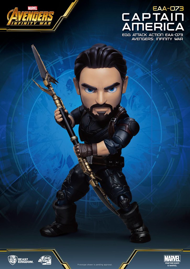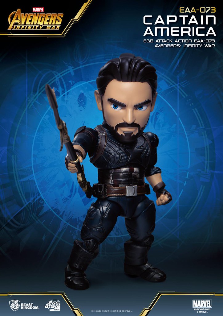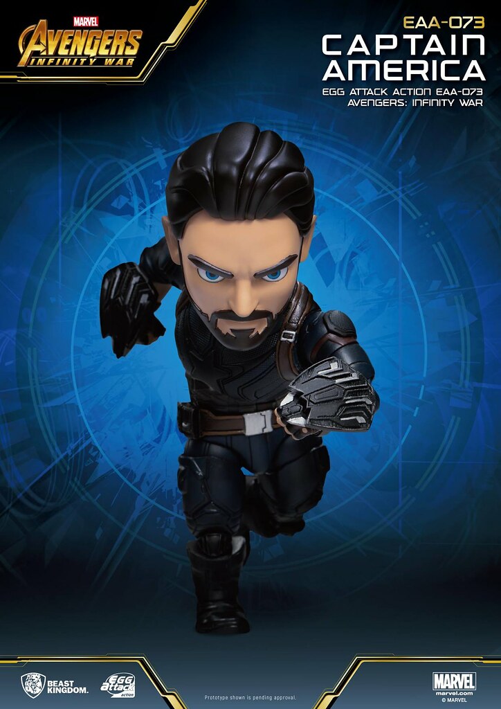 「EAA-072 美國隊長」高約16 公分,全身共計28 可動,有著堅定、嚴肅的眼神,並且搭載可動眼球設計使表情能有更多變化,但從官圖來看頭髮跟鬍子的顏色有些太深,貼身戰衣施以寫實的舊化處理,各處的紋路細節也考究還原電影造型,武器配件包含兩枚具備伸縮機構的瓦甘達爪盾和「亡刃(Corvus Glaive)」的金色長矛,長矛同樣展現了高水準的逼真做舊,搭配多個替換手型即可還原隊長帥氣的戰鬥姿態。