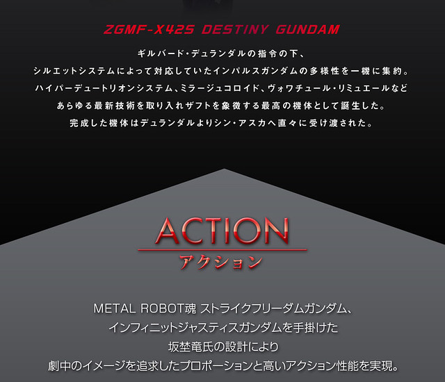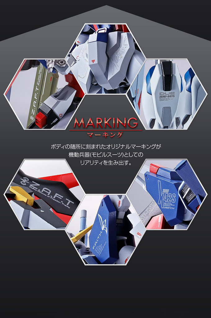 由日本BANDAI SPIRITS 公司收藏事業部發行,結合厚重金屬質感、高度造型力、 可動結構的「METAL ROBOT魂」系列繼「攻擊自由鋼彈」、「無限正義鋼彈」後,日前再度發表了出自《機動戰士鋼彈SEED DESTINY》的最新商品「ZGMF-X42S 命運鋼彈」預計於 2019 年 05 月發售的消息。