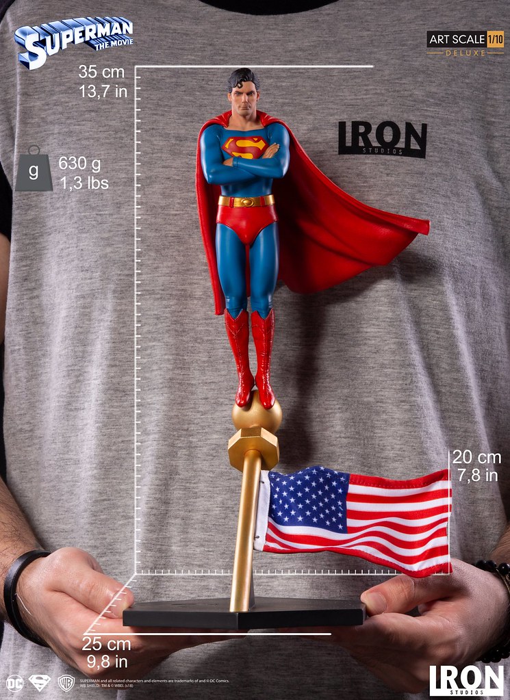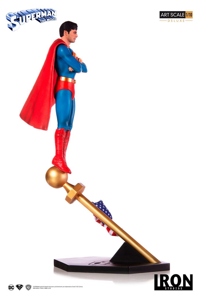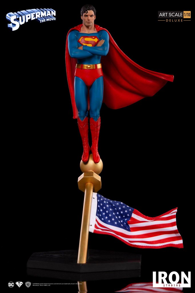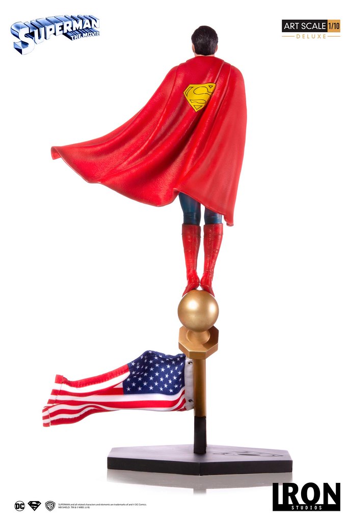 「超人 豪華版 1/10 比例全身雕像」高約35 公分,呈現出超人雙手交叉抱胸,站在美國國旗旗杆之上的姿態,頭雕傳神地描繪出演員克里斯多福·李維的神情與臉部輪廓,真的是相當帥氣呀~緊身衣施以寫實的皺摺刻畫,披風則形塑出飛揚的動態感!長靴的縫線細節也忠實再現,黑色底座上有著經典的「S」標誌,而國旗也做出了被風吹拂的流動感。