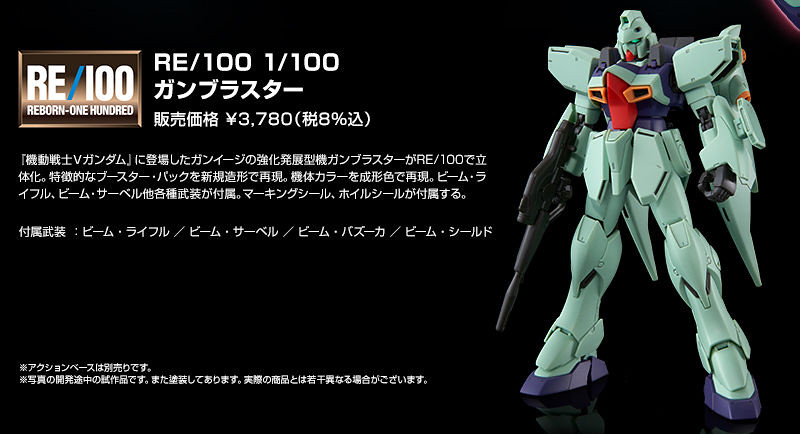 「RE/100 鋼布拉斯塔」以新規造型製作被稱為「雙馬尾」的推進平衡翼,平衡翼基部為可動設計。機體成形色也依據設定再現,並收錄光束步槍、光束軍刀、光束火箭炮、光束護盾等武裝,光束護盾表面的粒子波紋也透過印刷再現。此外日本 PB 目前正舉行特典活動,購入「RE/100 鋼布拉斯塔」必定能獲得特製水貼紙,收錄神聖軍事同盟所屬的多種圖樣!